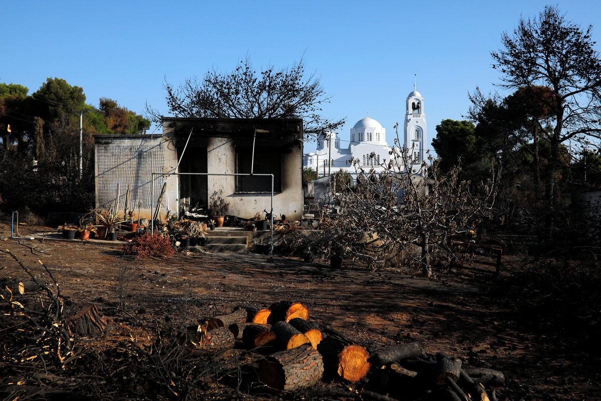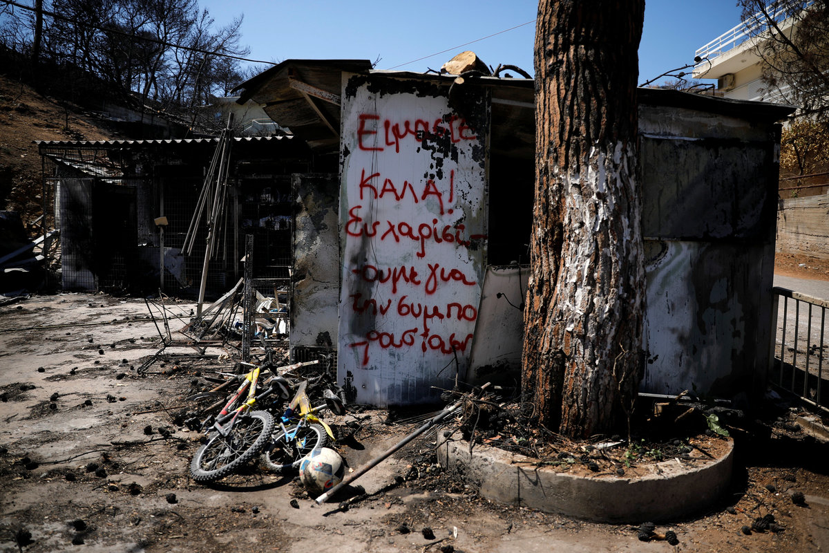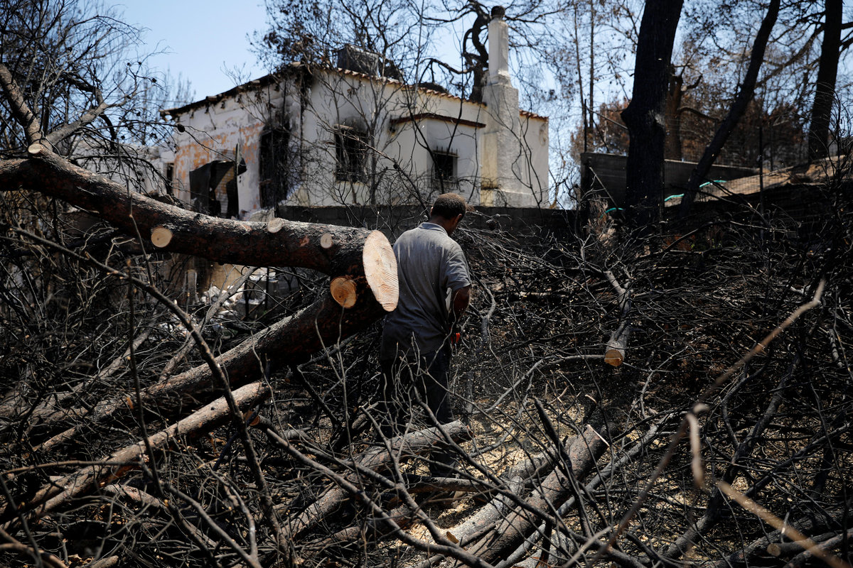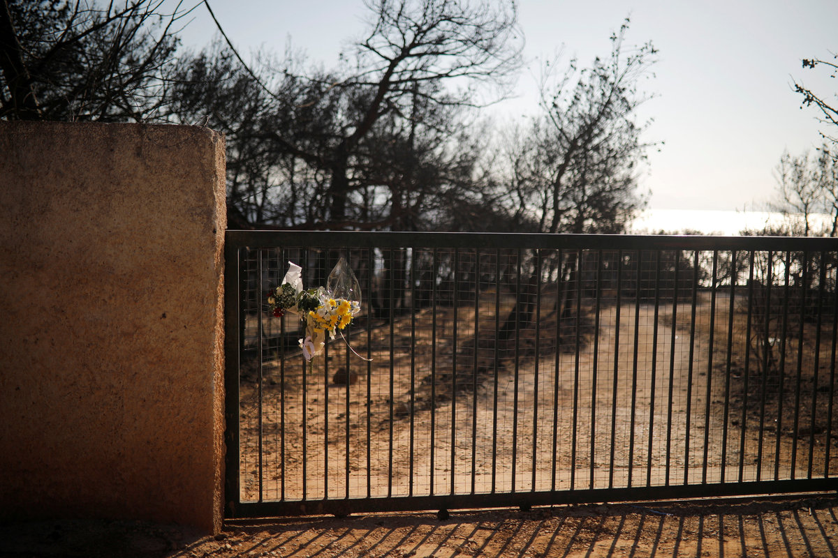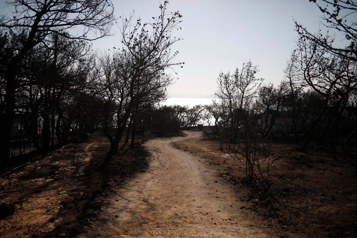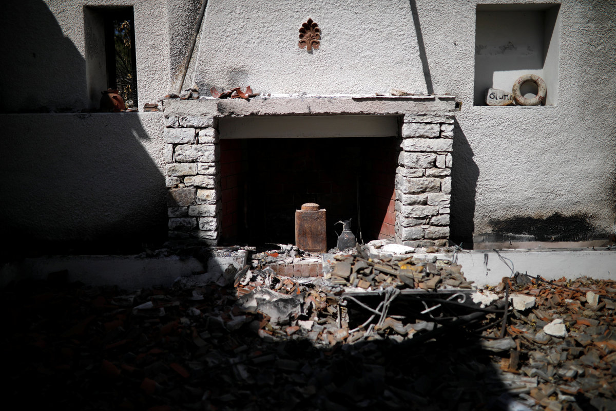 A worker looks on as he cuts down burned trees in the village of Mati, near Athens, Greece, August 22, 2018. Picture taken August 22, 2018. REUTERS/Alkis KonstantinidisA sign is sprayed on the shop and house of Theodoros Kouris, indicating that the building is to be demolished, in the village of Mati, near Athens, Greece, August 22, 2018. Picture taken August 22, 2018. REUTERS/Alkis KonstantinidisA view of a burned house, as a church is seen in the background, in the village of Mati, near Athens, Greece, August 22, 2018. Picture taken August 22, 2018. REUTERS/Alkis KonstantinidisTheodoros Kouris, 43, stands in front of his destroyed shop and house, in the village of Mati, near Athens, Greece, August 22, 2018. Picture taken August 22, 2018. REUTERS/Alkis KonstantinidisA view of a field where 26 people's bodies were found following a wildfire in the village of Mati, near Athens, Greece, August 22, 2018. Picture taken August 22, 2018. REUTERS/Alkis KonstantinidisFlowers are placed at the entrance of a field where 26 people's bodies were found following a wildfire in the village of Mati, near Athens, Greece, August 22, 2018. Picture taken August 22, 2018. REUTERS/Alkis KonstantinidisA burned car is seen in the village of Mati, near Athens, Greece, August 22, 2018. Picture taken August 22, 2018. REUTERS/Alkis KonstantinidisA fireplace is seen inside a destroyed house in the village of Mati, near Athens, Greece, August 22, 2018. Picture taken August 22, 2018. REUTERS/Alkis KonstantinidisA view of a field where 26 people's bodies were found following a wildfire in the village of Mati, near Athens, Greece, August 22, 2018. Picture taken August 22, 2018. REUTERS/Alkis KonstantinidisEleni Anagnostaki, 85, sits in the yard of her destroyed house in the village of Mati, near Athens, Greece, August 22, 2018. Picture taken August 22, 2018. REUTERS/Alkis KonstantinidisKaterina and her mother Maria gather debris inside their destroyed house in the village of Mati, near Athens, Greece, August 22, 2018. Picture taken August 22, 2018. REUTERS/Alkis Konstantinidis
