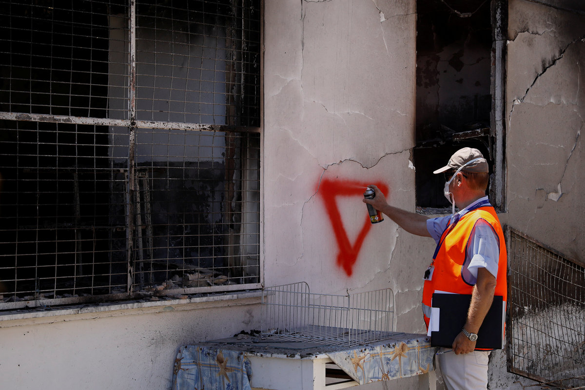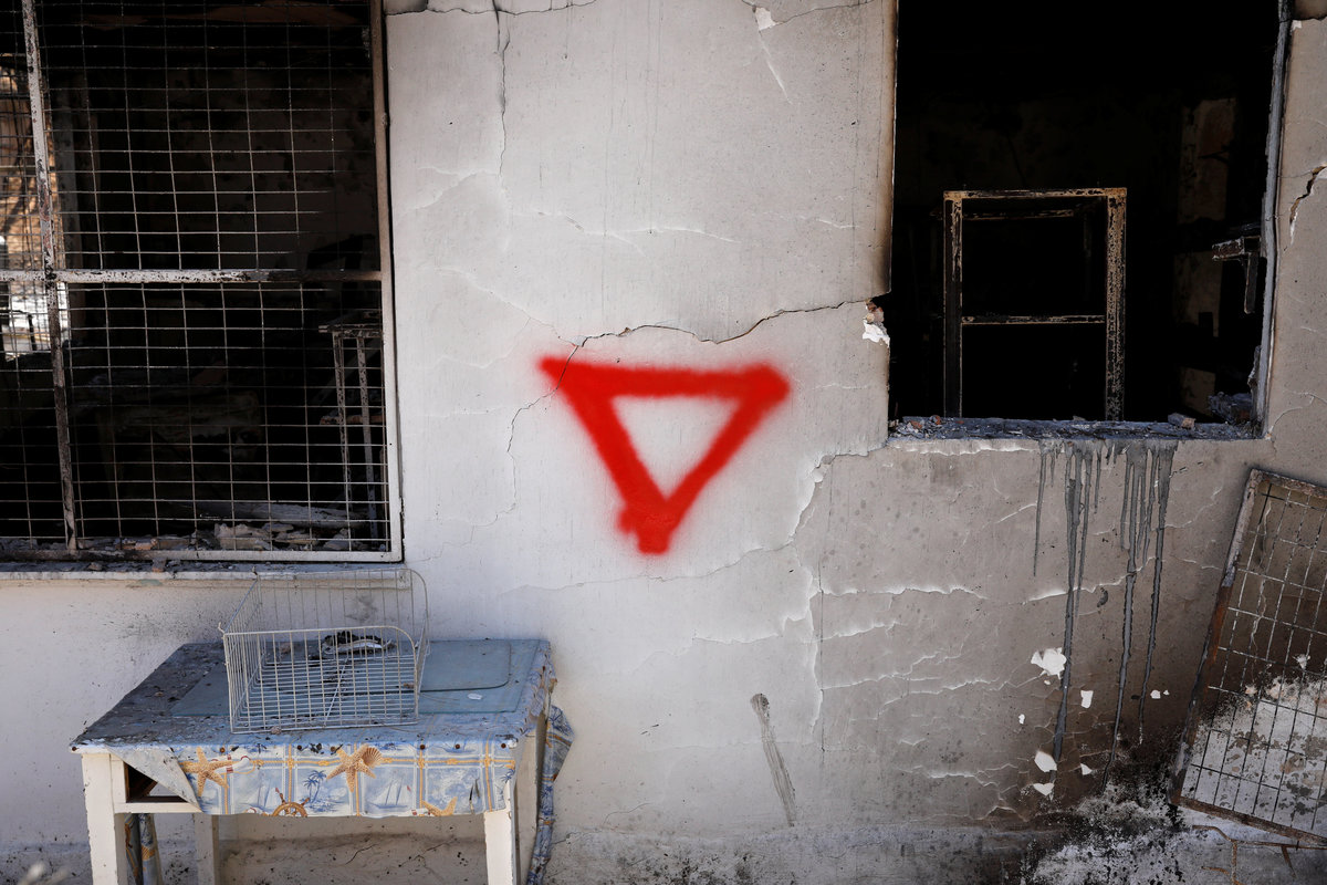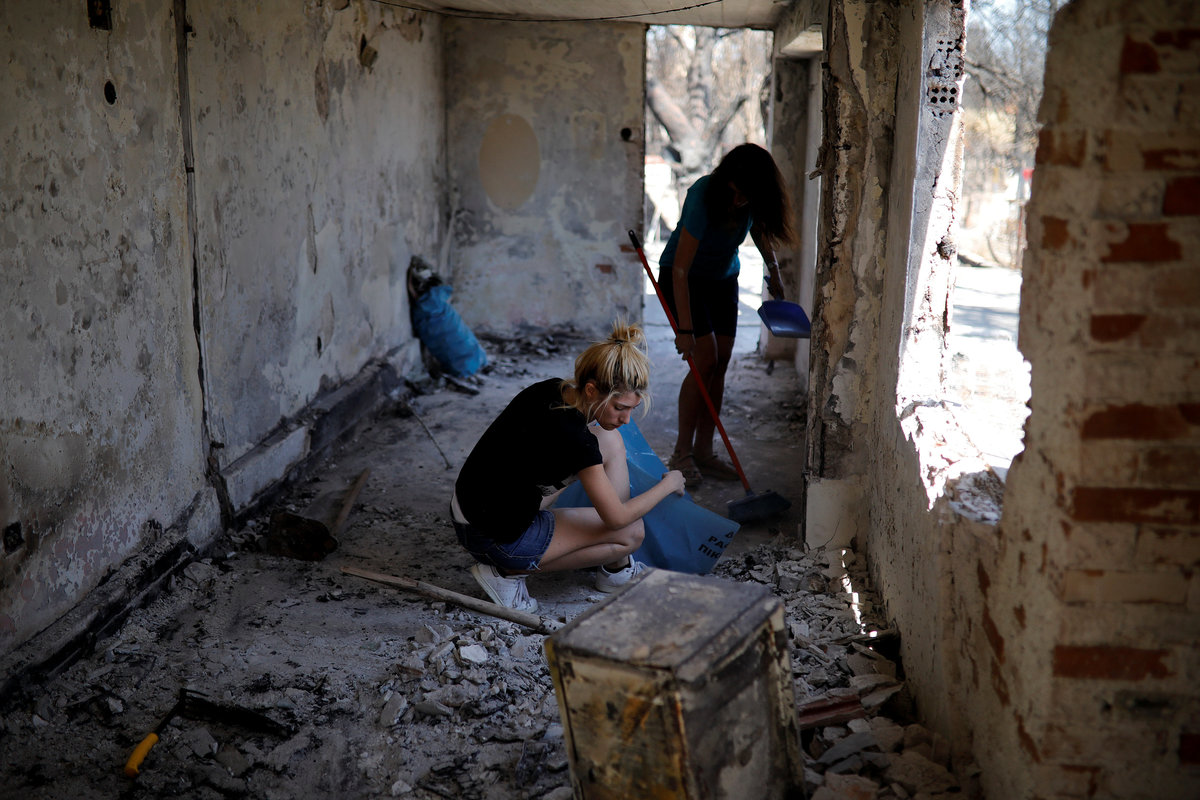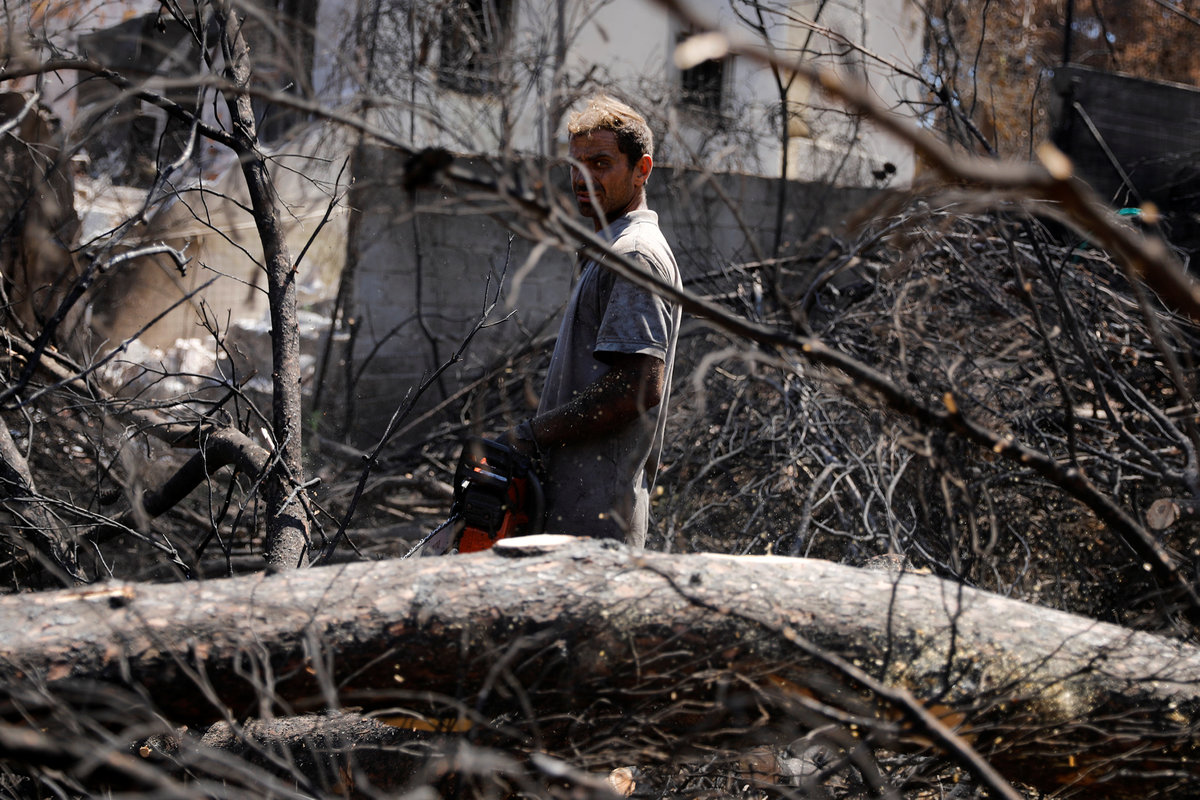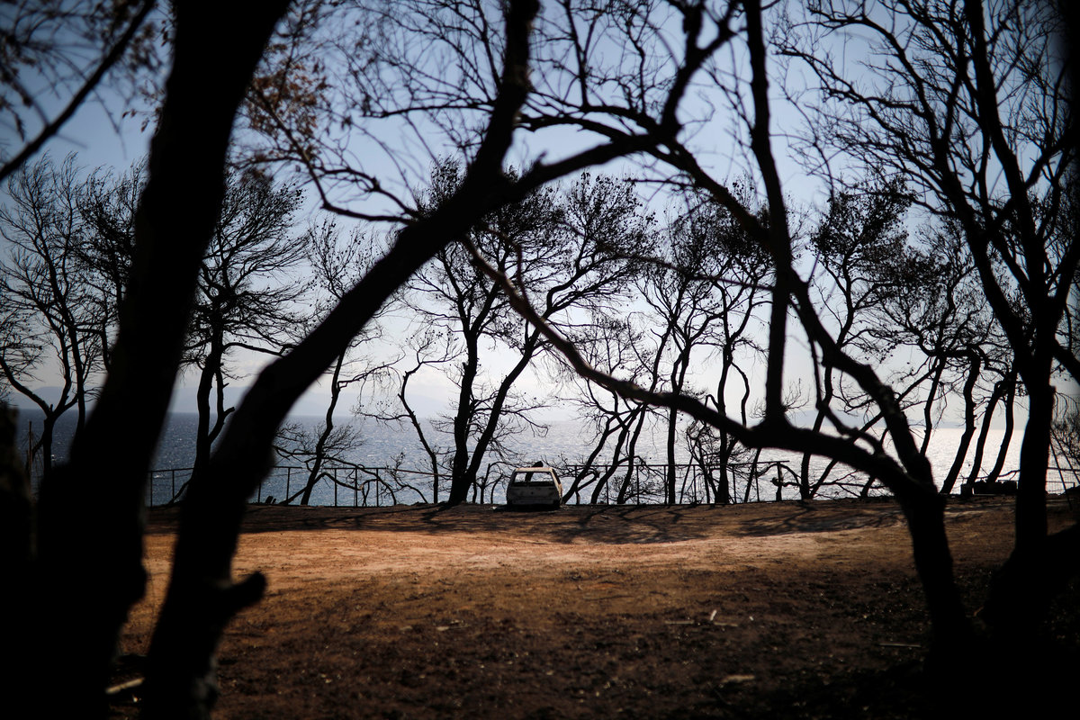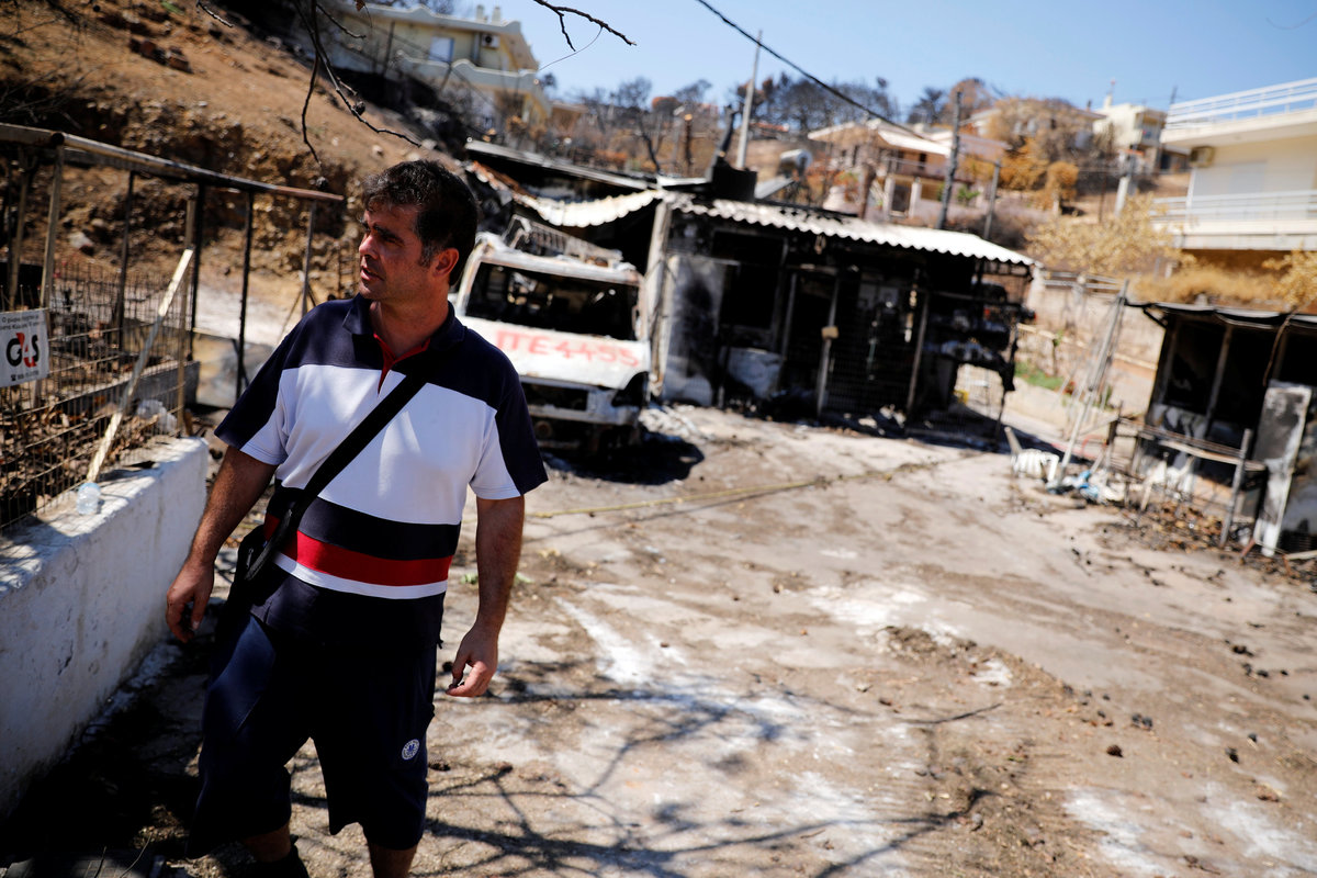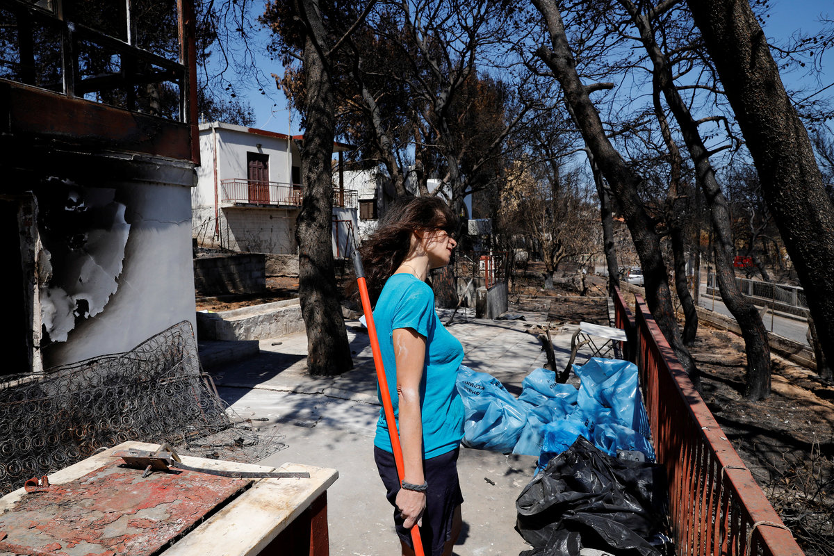 A worker looks on as he cuts down burned trees in the village of Mati, near Athens, Greece, August 22, 2018. Picture taken August 22, 2018. REUTERS/Alkis KonstantinidisA sign is sprayed on the shop and house of Theodoros Kouris, indicating that the building is to be demolished, in the village of Mati, near Athens, Greece, August 22, 2018. Picture taken August 22, 2018. REUTERS/Alkis KonstantinidisA view of a burned house, as a church is seen in the background, in the village of Mati, near Athens, Greece, August 22, 2018. Picture taken August 22, 2018. REUTERS/Alkis KonstantinidisTheodoros Kouris, 43, stands in front of his destroyed shop and house, in the village of Mati, near Athens, Greece, August 22, 2018. Picture taken August 22, 2018. REUTERS/Alkis KonstantinidisA view of a field where 26 people's bodies were found following a wildfire in the village of Mati, near Athens, Greece, August 22, 2018. Picture taken August 22, 2018. REUTERS/Alkis KonstantinidisFlowers are placed at the entrance of a field where 26 people's bodies were found following a wildfire in the village of Mati, near Athens, Greece, August 22, 2018. Picture taken August 22, 2018. REUTERS/Alkis KonstantinidisA burned car is seen in the village of Mati, near Athens, Greece, August 22, 2018. Picture taken August 22, 2018. REUTERS/Alkis KonstantinidisA fireplace is seen inside a destroyed house in the village of Mati, near Athens, Greece, August 22, 2018. Picture taken August 22, 2018. REUTERS/Alkis KonstantinidisA view of a field where 26 people's bodies were found following a wildfire in the village of Mati, near Athens, Greece, August 22, 2018. Picture taken August 22, 2018. REUTERS/Alkis KonstantinidisEleni Anagnostaki, 85, sits in the yard of her destroyed house in the village of Mati, near Athens, Greece, August 22, 2018. Picture taken August 22, 2018. REUTERS/Alkis KonstantinidisKaterina and her mother Maria gather debris inside their destroyed house in the village of Mati, near Athens, Greece, August 22, 2018. Picture taken August 22, 2018. REUTERS/Alkis Konstantinidis