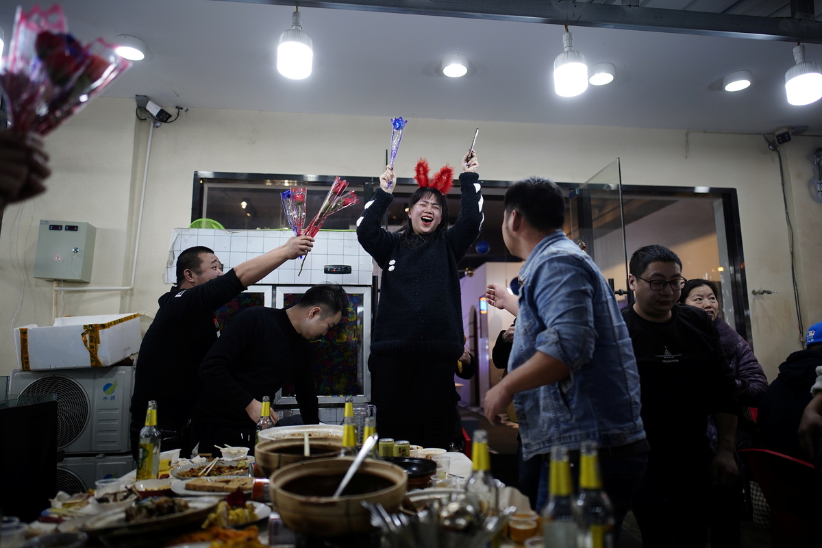 In a crowded Wuhan beer hall, Zhang Qiong wipes birthday cake from her face after a food fight with her friends.