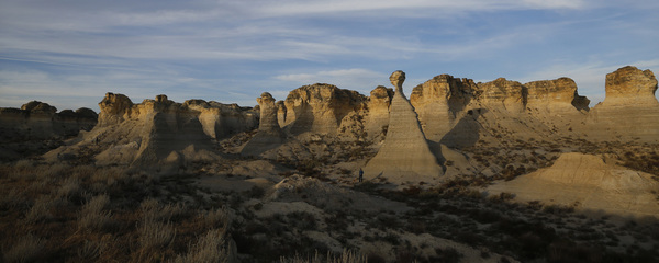 But when he rounded a bend on a dusty two-track road, Bain stopped his pickup at the mouth of a valley of rising rock formations, some reaching 100 feet into the air. Up to 200 yards in each direction were towering, blonde-colored rocks that ranged from spires rising to sharp points to straight-sided, flat-topped buttes.