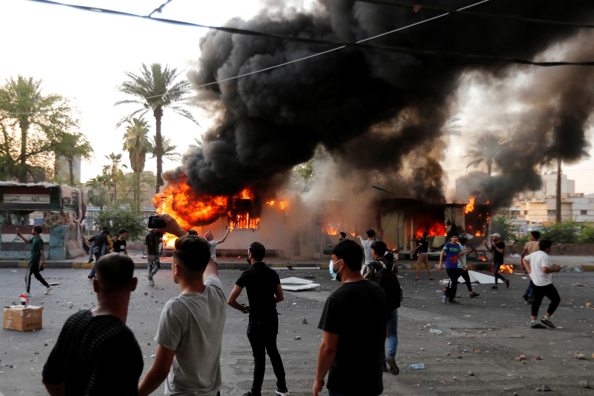 Hundreds demonstrated in Tahrir Square, shouting slogans against Iran-backed militias and accusing Prime Minister Mustafa al-Kadhimi's government of failing to answer for the deaths of dozens of activists shot dead in different parts of Iraq in recent months.