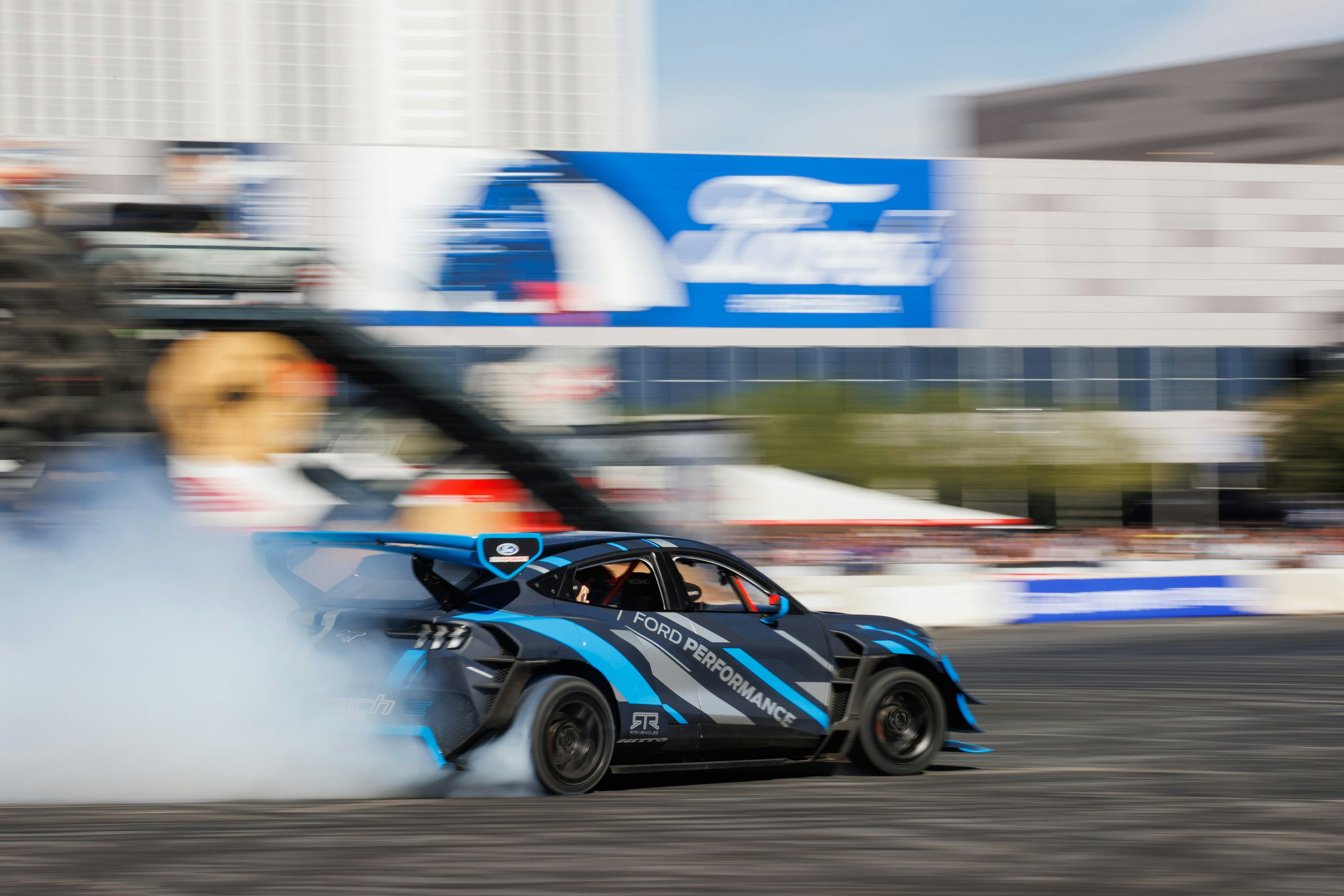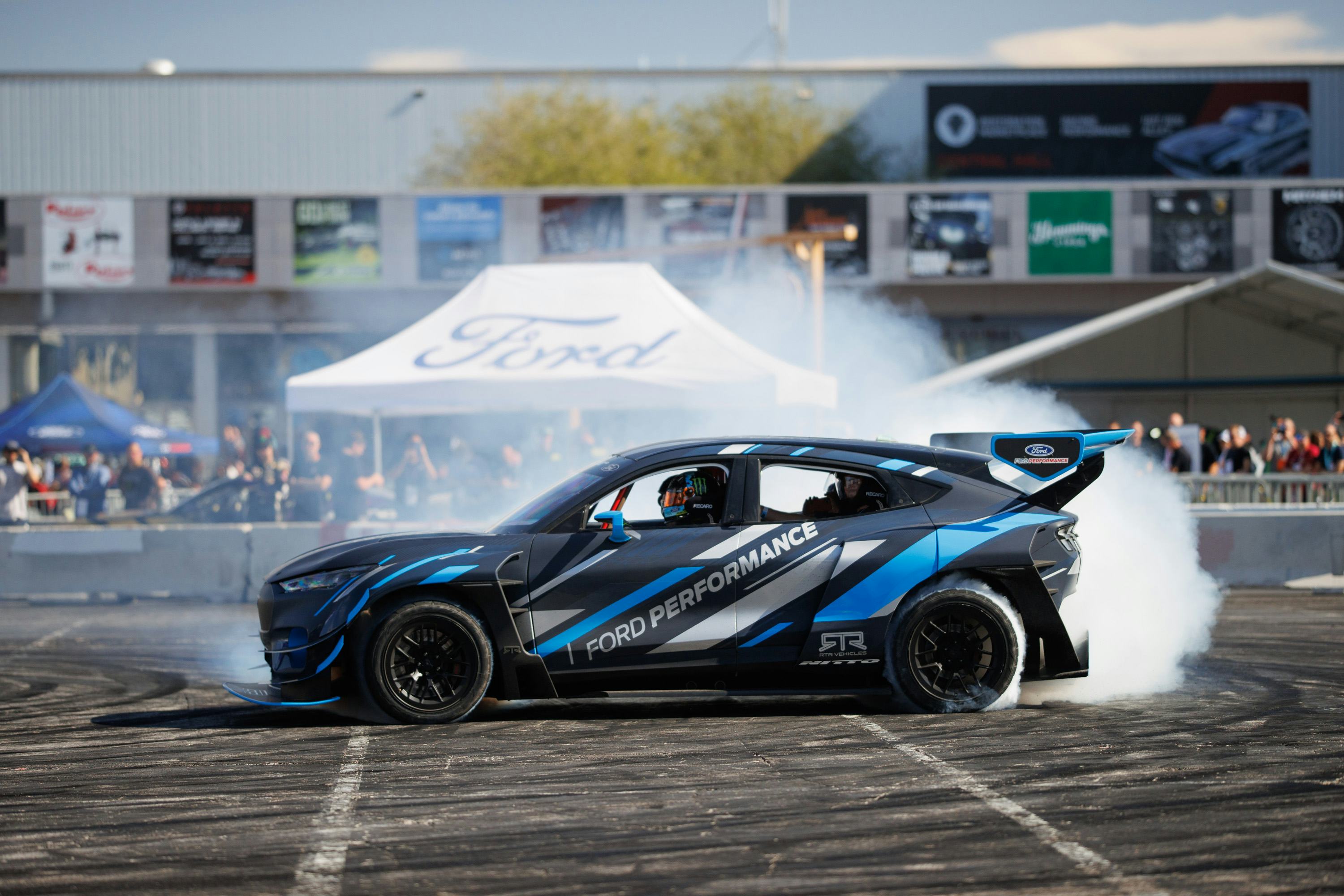 First, the car. It’s called the Mustang Mach-E 1400. A collaboration between Ford Performance and RTR (a racing team founded by 2020 Formula Drift champion Vaughn Gittin Jr.) it has seven electric motors.