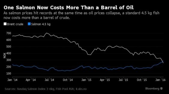 That makes a barrel of oil cheaper than a single salmon. Bloomberg noticed the original report and produced the following chart to illustrate it.