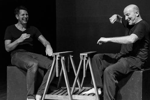 This form of physical storytelling comes naturally to Deaf actor Shaun Fahey, despite having no formal theatre training before he started work on productions with Equal Voices Arts and director Laura Haughey. Serbian actor Mihailo Lađevac (hearing), who brings more than 20 years of professional acting experience to these productions, learnt from Fahey’s physical storytelling in rehearsal, just as Fahey learnt from Lađevac’s depth of expertise. With neither actor having English as a first language, they started exploring ideas using only physical storytelling and mime.