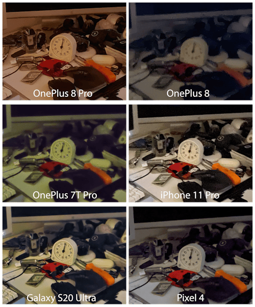 At 100x crop, the differences in the detail are more apparent. As you can see, the night mode on the OnePlus 8 Pro is a major leap forward compared to the very noisy 7T Pro and even the iPhone 11 Pro and Pixel 4. For whatever reason, the OnePlus 8 failed to capture a sharp image.