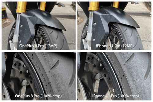 Below, you can see how details on the OnePlus 8 Pro compares to the iPhone 11 Pro. The 8 Pro's main camera has a shallower depth of field so details are less sharp at the edges, but it's nowhere near as bad as on the S20 Ultra.