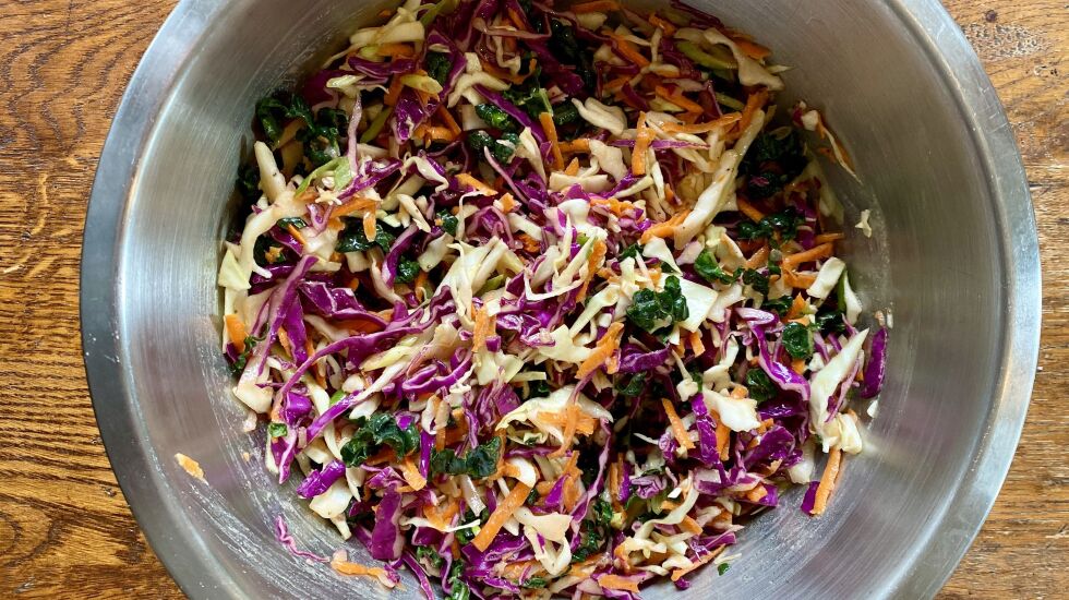 2. Combine the slaw ingredients in a large bowl. Add the dressing and toss to thoroughly combine.