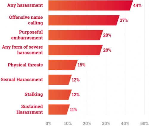 Overall harassment, however, has dropped, according to the ADL's findings. Falling from 53 percent based on last year's data to 44 percent this year, the overall cases of "severe harassment" which would involve sexual harassment, forced exposure of an individual's personal information like their home address (or doxxing), threats of physical violence have all decreased.
