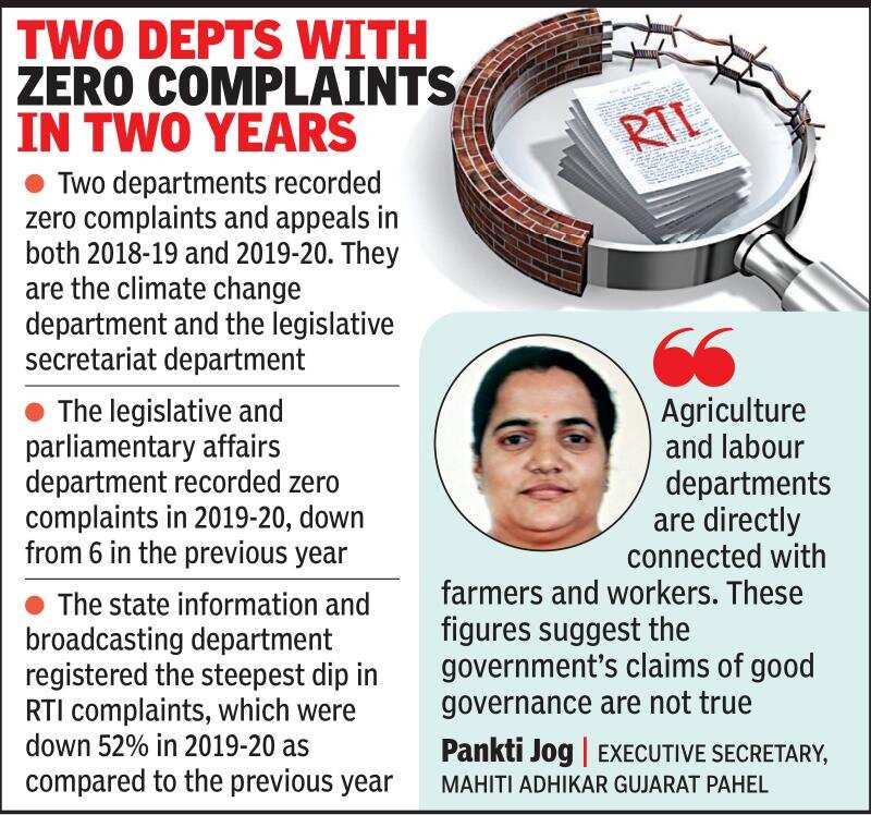 AHMEDABAD: While there has been a decline in the number of complaints and appeals under the Right to Information (RTI) Act in most departments of the state government, only two departments registered an increase in the number of appeals and complaints in 2019-20 as compared to the previous year 2018-19. They are the agriculture and co-operation and the labour and employment departments.