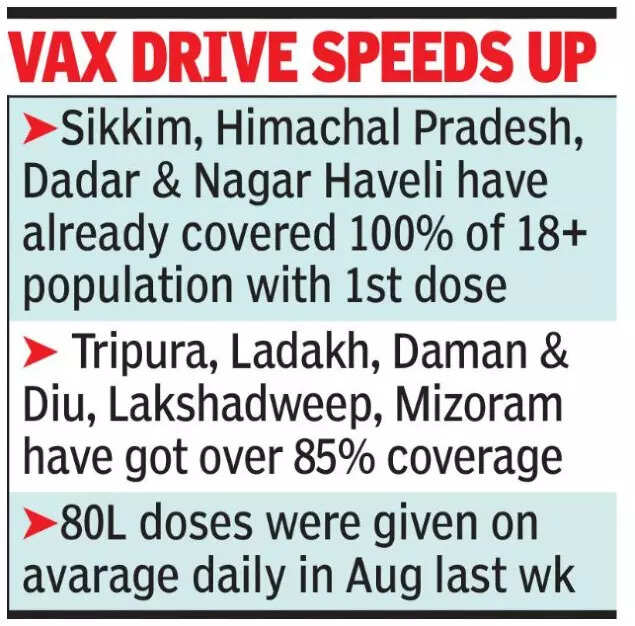 With vaccination getting a major push in the last week of August, many smaller states and Union Territories have achieved or are nearing 100% coverage of adult population with the first dose. While Sikkim, Himachal Pradesh and Dadar & Nagar Haveli have already covered 100% of 18 plus population with the first dose, others like Tripura, Ladakh, Daman & Diu, Lakshdweep and Mizoram have got over 85% coverage, officials said.