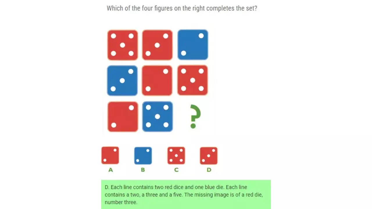 Your challenge is to identify the suitable option (A, B, C, or D) that can fill the vacant position in the third row of dice. Ready for the challenge? You have only 30 seconds... Go! 30... 20... 10, 9, 8, 7, 6, 5, 4, 3, 2, and 1... Time's up!