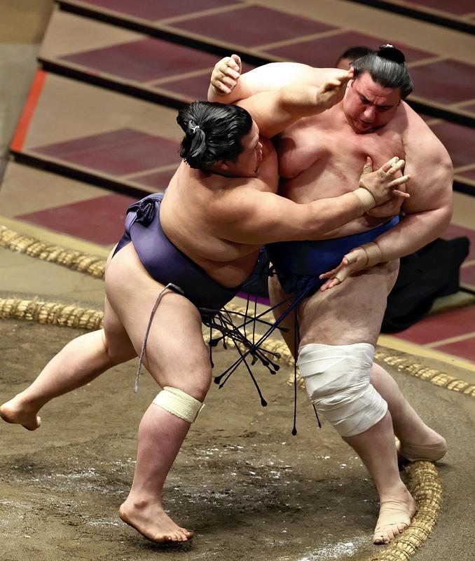 In the penultimate bout, ozeki Takakeisho used a series of pushes to power No. 3 maegashira Myogiryu (3-2) out for his fourth victory, while ozeki Asanoyama improved to 2-3 by making quick work of No. 2 maegashira Tamawashi (2-3) in the day's final matchup.