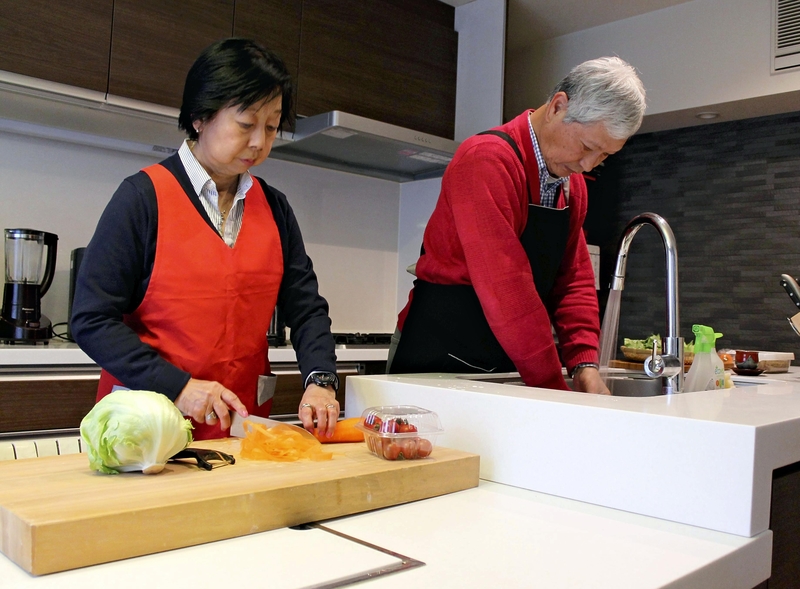 A 71-year-old man and his 66-year-old wife in Setagaya Ward, Tokyo, have an open kitchen in which the sink and stove are placed opposite each other. Since both like cooking, they created a space between the two counters that is wide enough for them to pass each other.