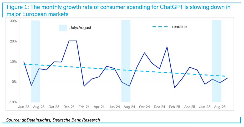 User spending on ChatGPT has “stalled” and “the value of OpenAI subscriptions, which surged from a standing start in January 2023, has flatlined in the major European markets over the past four months,” according to new data published by Deutsche Bank.