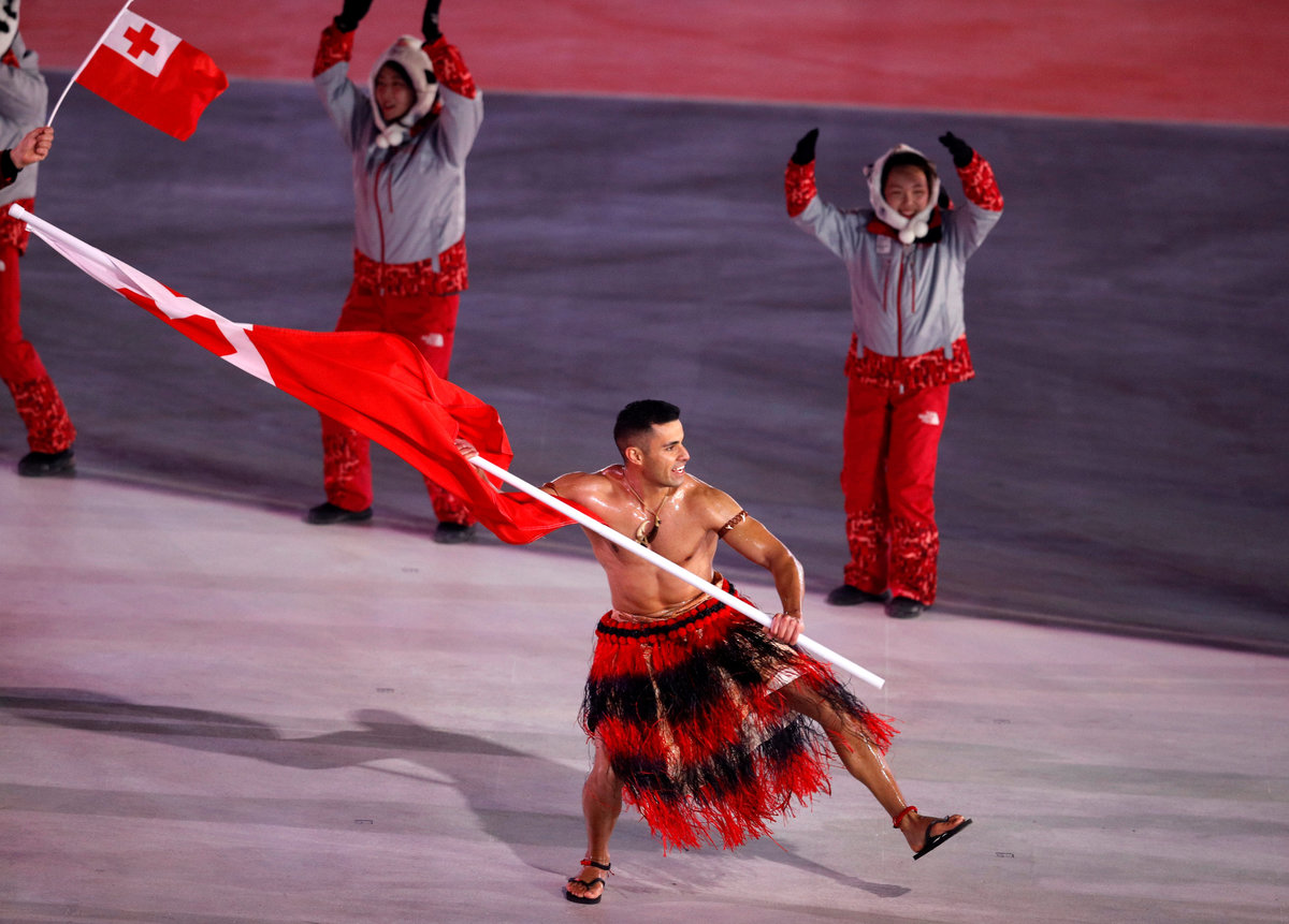 At Friday's icy opening ceremony where teams marched in colorful uniforms in the parade of nations, few could match Tonga's topless flag-bearer Pita Taufatofua.