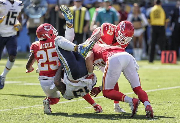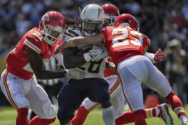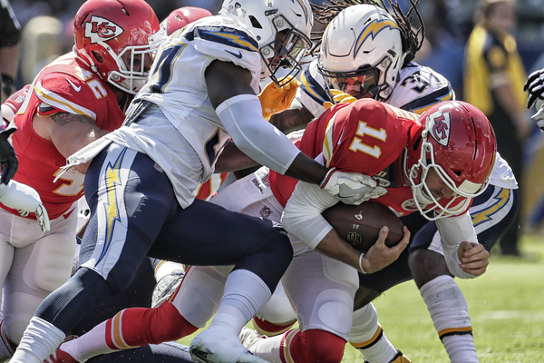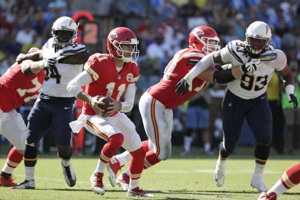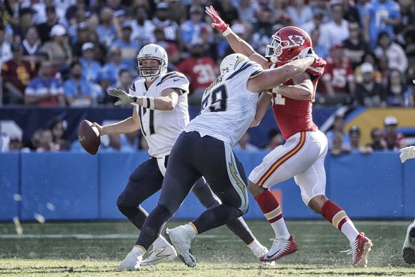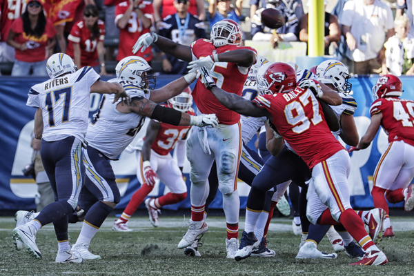 While the Chargers harassed Smith, sacking him five times throughout the contest, the Chiefs defense failed to match that kind of rush (only one sack) but consistently made enough plays to get off the field on third down. This short-circuited several promising drives by Los Angeles, including two in Chiefs territory, just beyond midfield.