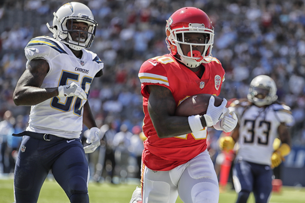 On just the third play from scrimmage, cornerback Terrance Mitchell picked off a Philip Rivers pass to set up the Chiefs' first score, a 30-yard pass from quarterback Alex Smith to receiver Tyreek Hill that put them ahead 7-0.