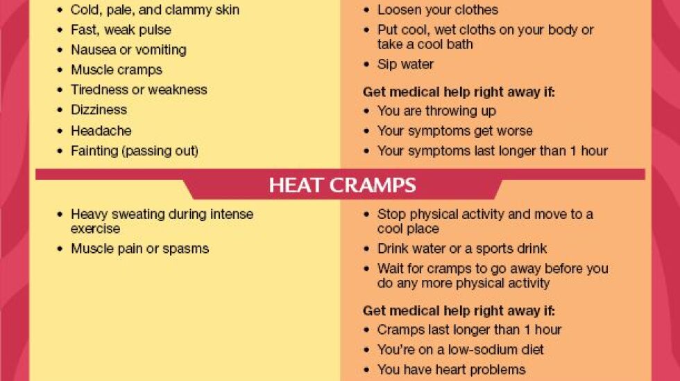 If not treated, heat exhaustion can lead to heat stroke. Symptoms include confusion and loss of consciousness.