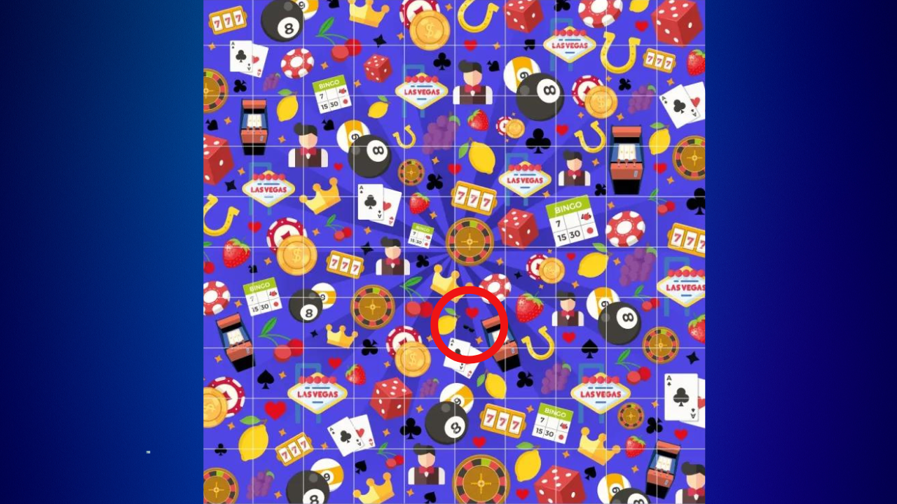 Look at this mysterious picture in front of you! Scattered across the canvas is are elements with a casino motif; the icons range from playing cards and dice to slot machines and colourful fruits. The elusive reward is hidden among this collection of images—a pair of sunglasses that have been cleverly blended into the jumbled environment.