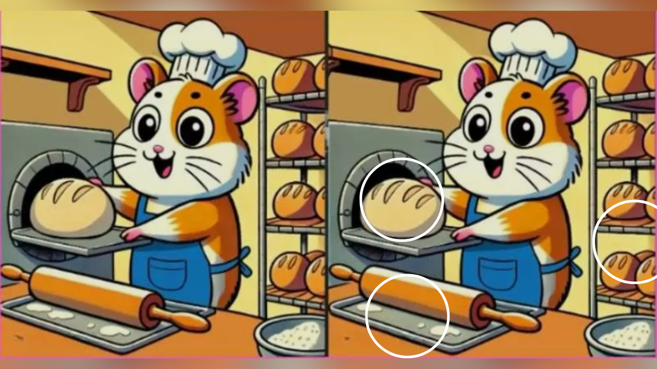 In this puzzle, you’ll see a hamster happily baking bread. The two images might look almost identical at first glance, but there are three small changes hidden in the scene. Your task is to find them as quickly as possible!