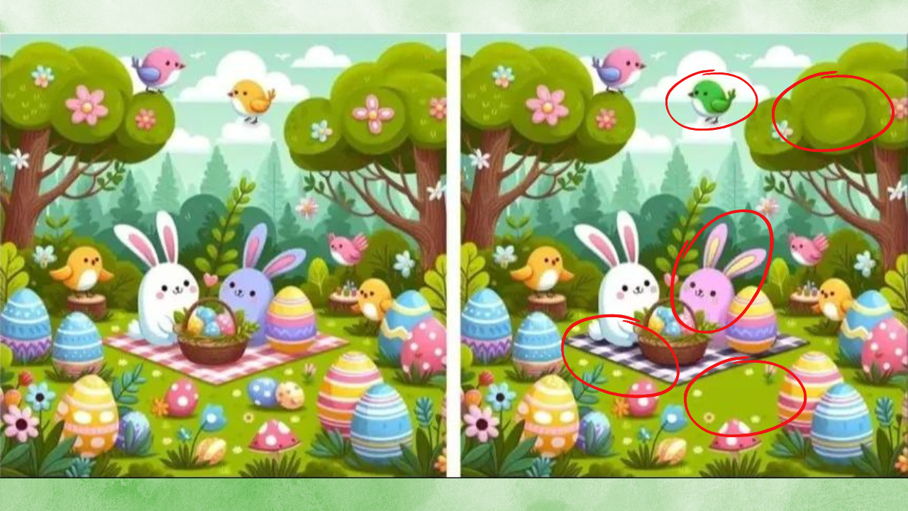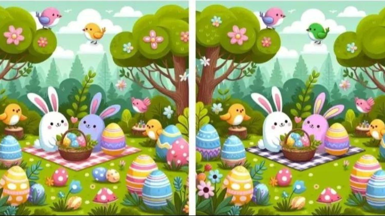 A charming Easter-themed picnic complete with cheerful bunnies, vibrant spring flowers, and chirping birds set against a backdrop of sunny skies. But amid the festive scene lies a puzzle waiting to be solved. Your mission is to spot all five elusive differences hidden within the images. Sounds easy, right? Think again!