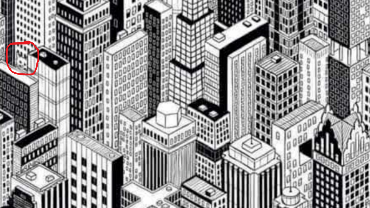 The image above, in black and white, shows a skyscraper vista. You have seven seconds to locate the cat that is hidden in the photograph, as the title suggests.