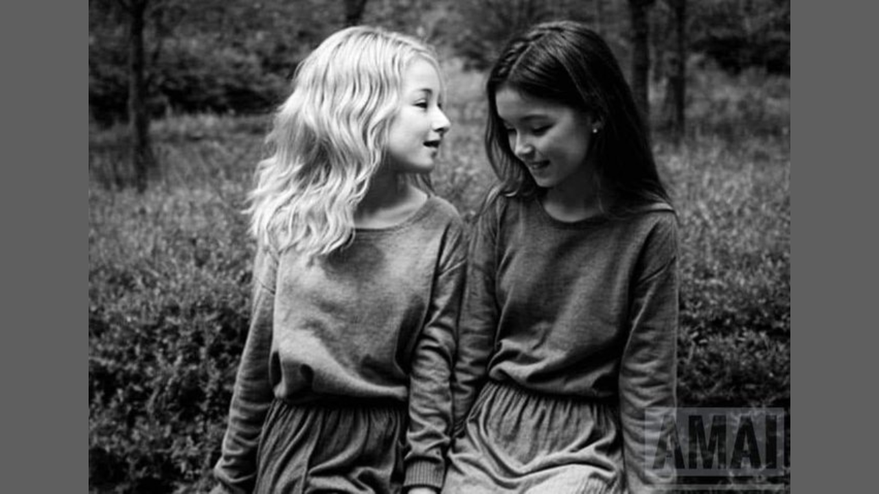What do you see in this image? Two young girls sitting together, engaged in a candid conversation. Right?