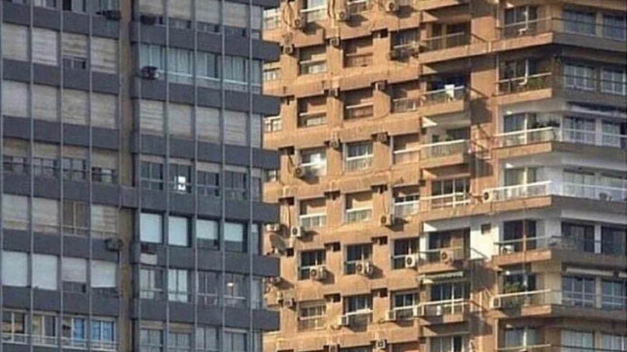 This image has captivated many with its brilliant capture. It is very hard to say which one of the two buildings is in the front and is closer. While a few say the brown building is the one at the front, some others argue it is the other one that is in the front.