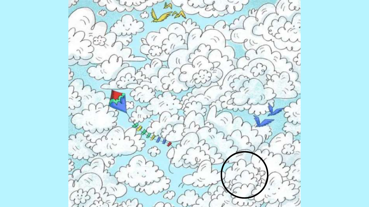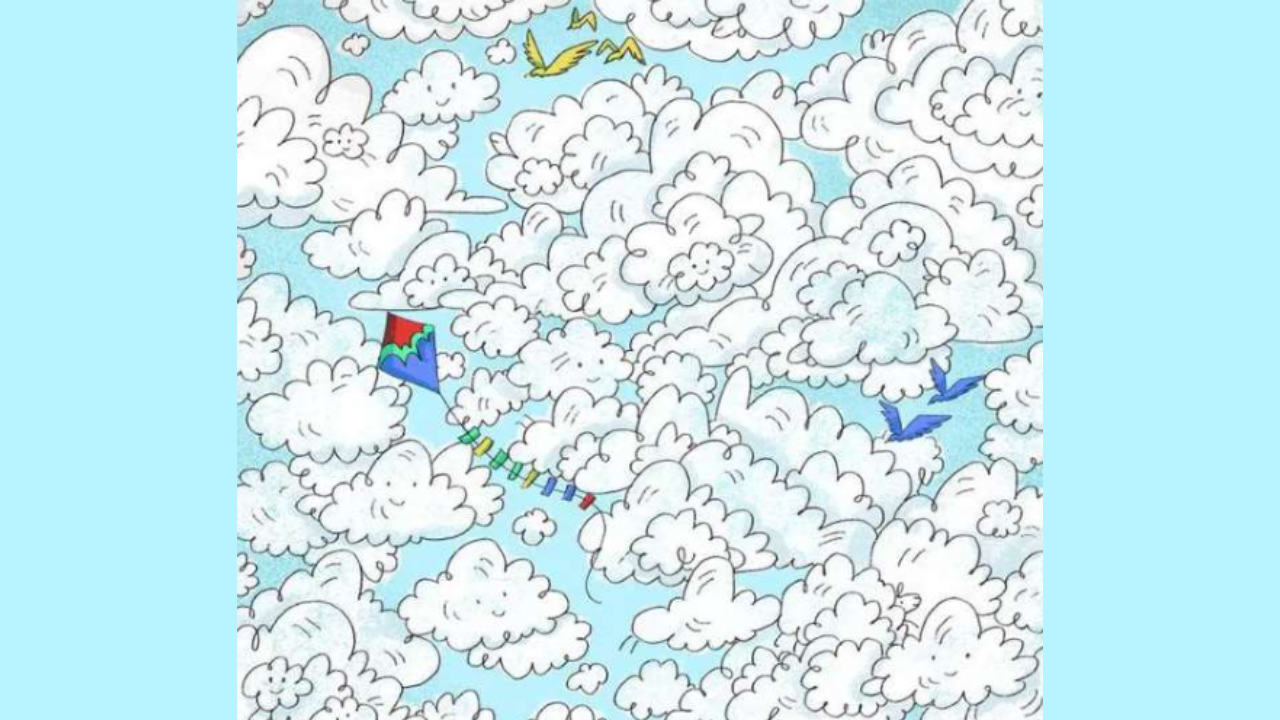 In this image, you can see a bunch of adorable clouds in the sky. Also featured in this artwork are colorful birds and a beautiful kite. However, your task is to find something more challenging. You have to find a sheep in this image, that too within 10 seconds. So, are you up for this challenge? Your time starts now!