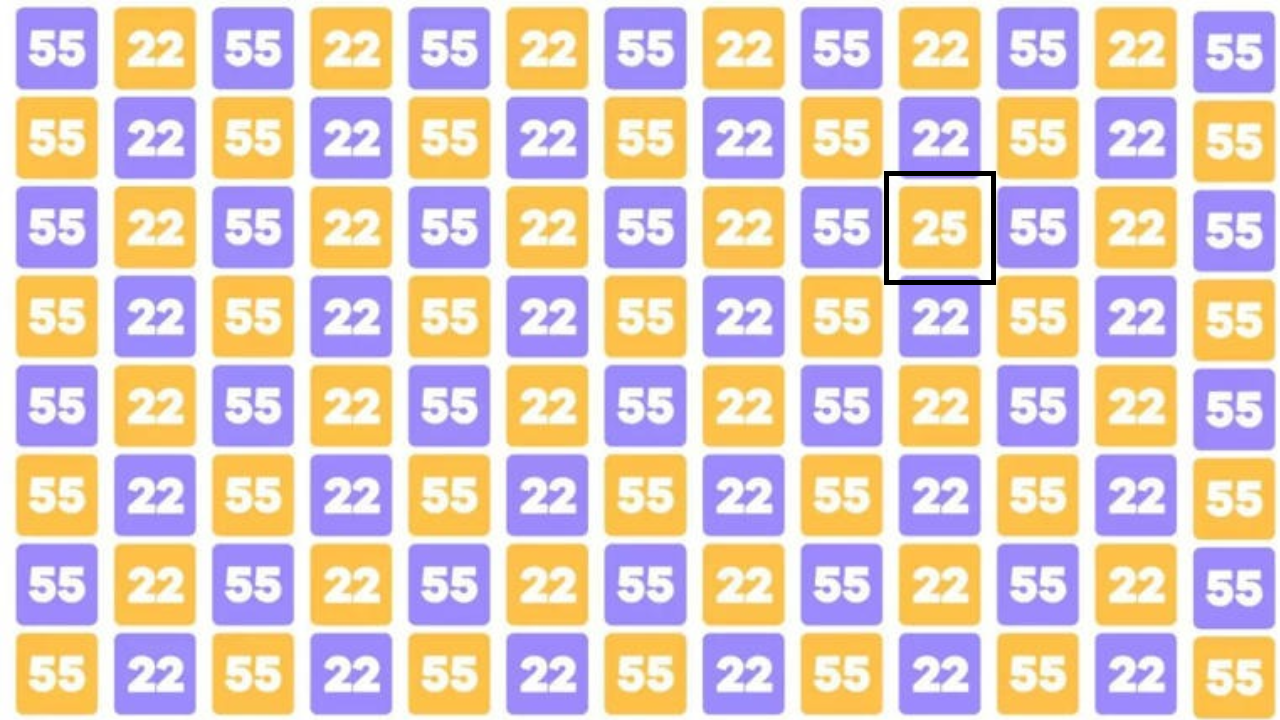 The puzzle is a grid of identical number pairs. On first glance, the grid looks uniform, but in this array, there is a single '25' that does not have a pair. The task is to find this lone number as quickly as possible.