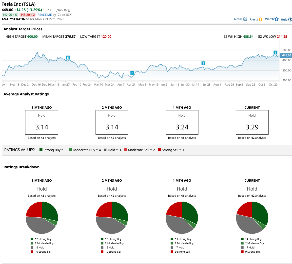 Wall Street analysts remain split on Tesla, as evidenced in the stock’s consensus “Hold” rating. Of the 42 analysts covering Tesla, 14 assign it a “Strong Buy” rating and two a “Moderate Buy,” while 17 recommend holding and nine give it a “Strong Sell” rating. Tesla bulls remain optimistic due to Musk’s bold promises in AI, robotics, and self-driving technology, while bears point to profitability struggles with more weakening ahead, an unjustified valuation (263.30x forward non-GAAP P/E), and a damaged brand image. Notably, the stock currently trades at a premium to its mean price target of $376.37.