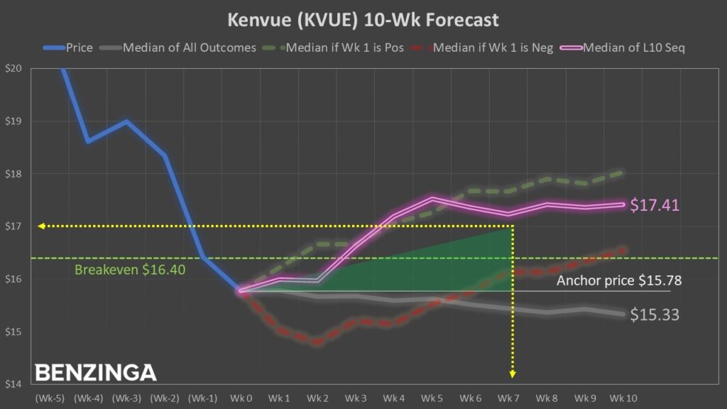 Specifically, KVUE in the past 10 weeks has printed a 2-8-D sequence: only two up weeks (defined as the return between Monday's open and Friday's close), eight down weeks, with an overall downward trajectory. On a rolling basis since its spinoff, this sequence has only materialized eight times. Therefore, no one can make an absolute statistical forecast. However, the median price of outcomes associated with the aforementioned sequence tends to rise sharply.