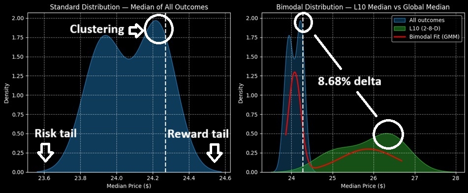 Obviously, what makes this trade so compelling is that density dynamics point to $26.30 being the most likely median outcome stemming from the 2-8-D sequence. In many cases, the clustered price aligns with the breakeven threshold and you're left hoping for some luck to trigger the max payout. Here, the clustered price aligns with the second-leg strike, which is an incredibly alluring proposition.