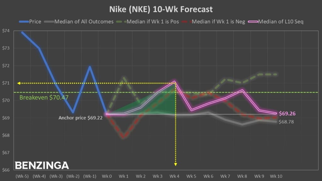 Using pricing data going back to January 2019, NKE exhibits roughly coin-toss odds when it comes to the exceedance ratio between NKE's projected closing price and its anchor (starting point). From the first week to the tenth, the exceedance ratio ranges from 46.7% to 51.2%.