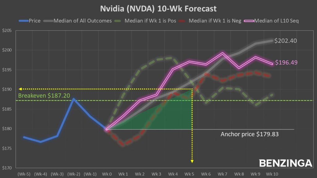 That seems to be the case for NVDA stock. When tagging the 4-6-D sequence, we can observe that median prices from 10-week returns are projected to cluster around the $196 level. In other words, the probability of upside remains bullish but the likelihood of a specific magnitude of upside is more reliably frequent.