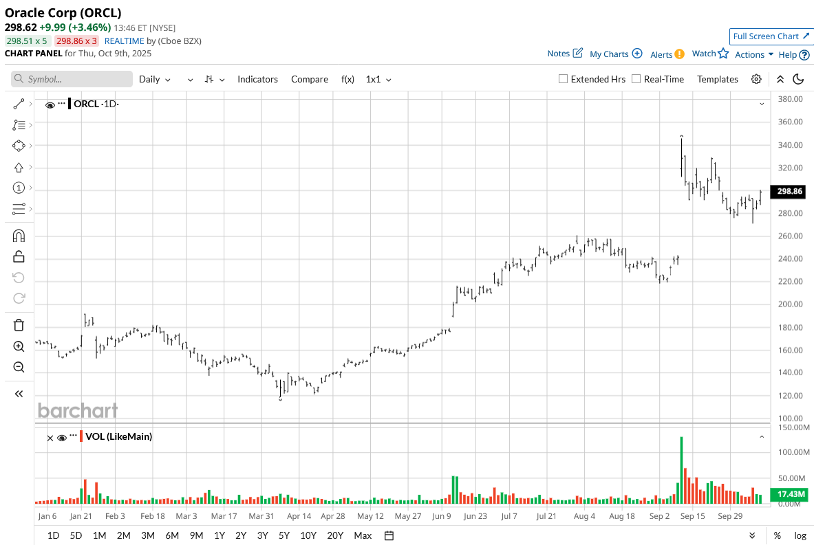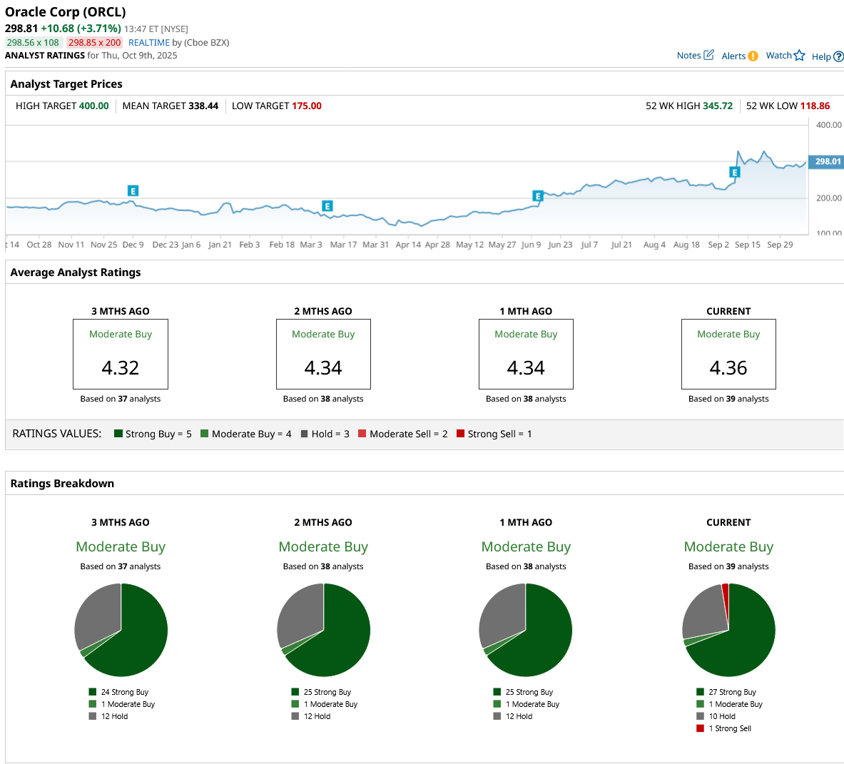 Out of the 39 analysts covering ORCL stock, 27 recommend “Strong Buy,” one recommends “Moderate Buy,” 10 recommend “Hold,” and one recommends “Strong Sell.” The average stock price target for ORCL is $338, which is above the current price of $298.
