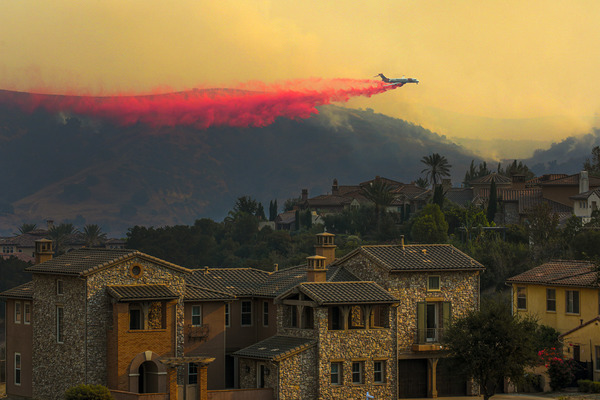 SANTA ANA., Calif. — Orange County on Monday was under siege from two wind-driven brush fires that forced 90,000 people from their homes, critically injuring two firefighters and leaving many others on edge.