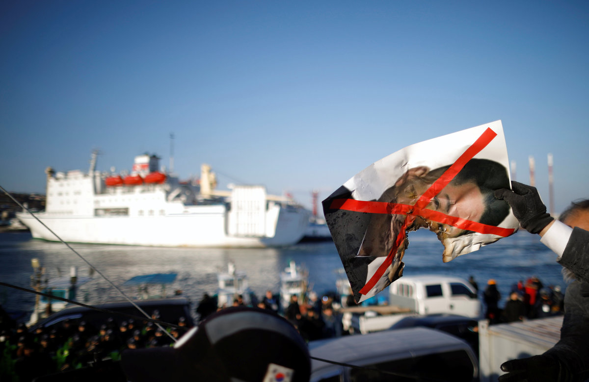The 9,700-tonne ferry, the Mangyongbong 92, was escorted into the eastern South Korean port of Mukho, where throngs of demonstrators were waiting. Some held large photos of the North's leader, Kim Jong Un, with black crosses drawn through them.