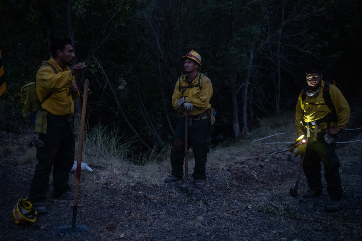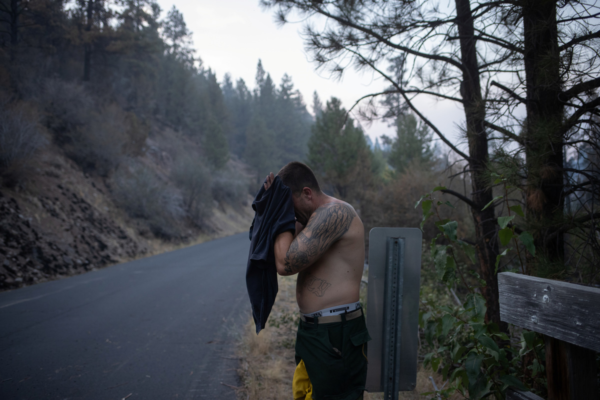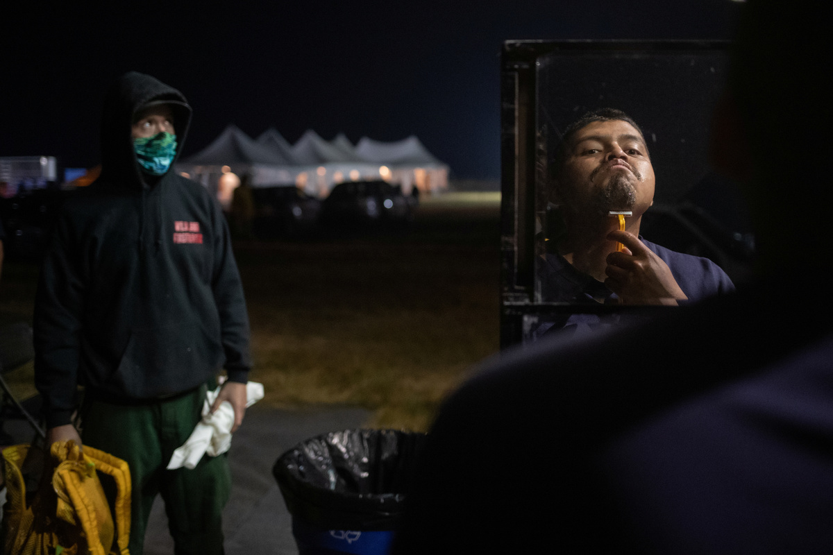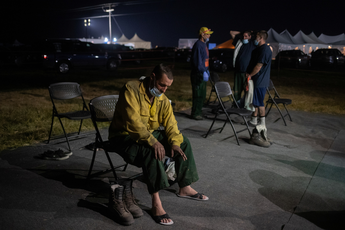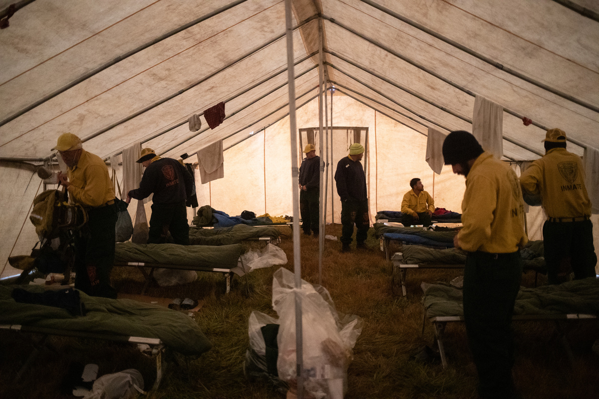 Edgar Maya, 30, Matthew Tice, 37, and Armando Gomez-Zacarias, 24, who are inmates from Warner Creek Correctional Facility, working as firefighters, wait for the rest of the firefighting crew after descending in the dark out of Fremont National Forest, where they were helping to mop up hotspots from the Brattain Fire, near Paisley, Oregon, U.S., September 19, 2020. REUTERS/Adrees Latif A dust devil kicks up ash and dirt in the aftermath of the Brattain Fire near Fremont National Forest near Paisley, Oregon, U.S., September 19, 2020. REUTERS/Adrees Latif Inmates from Warner Creek Correctional Facility, working as firefighters, are transported in a secure vehicle as they travel towards the Brattain Fire, Paisley, Oregon, U.S., September 19, 2020. REUTERS/Adrees Latif Inmates from Warner Creek Correctional Facility put on flame-resistant clothing as they wake up and get ready to help mop up hotspots from the Brattain Fire, in Paisley, Oregon, U.S., September 19, 2020. REUTERS/Adrees Latif A ponderosa pine tree is cut down after having burnt in the Brattain Fire, at Fremont National Forest, near Paisley, Oregon, U.S., September 19, 2020. REUTERS/Adrees LatifA sign reading "We Will Beat This Together, COVID-19" stands at a camp where inmates from Warner Creek Correctional Facility, working as firefighters, were being housed, while helping to mop up hotspots from the Brattain Fire in Paisley, Oregon, U.S., September 19, 2020. REUTERS/Adrees Latif Joshua Rutledge, 42, and Guillermo Rojas, 29, who are inmates from Warner Creek Correctional Facility, working as firefighters, prepare to help mop up hotspots from the Brattain Fire, after waking up in Paisley, Oregon, U.S., September 19, 2020. REUTERS/Adrees LatifSmoke rises up from the Brattain Fire, as trees burn in Fremont National Forest, in Paisley, Oregon, U.S., September 18, 2020. REUTERS/Adrees Latif Inmates from Warner Creek Correctional Facility, working as firefighters, help to distribute lunch to firefighters and first responders tasked with helping to mop up hotspots from the Brattain Fire in Paisley, Oregon, U.S., September 21, 2020. REUTERS/Adrees LatifThe belongings of an inmate from Warner Creek Correctional Facility, working as a firefighter, is left next to his bed where he and other inmates are camping out on the sidelines of the Brattain Fire, helping to mop up hotspots, in Paisley, Oregon, U.S., September 21, 2020. REUTERS/Adrees LatifGuillermo Rojas, 29, an inmate from Warner Creek Correctional Facility, working as a firefighter, has his temperature checked before heading into the field to help mop up hotspots from the Brattain Fire in Paisley, Oregon, U.S., September 21, 2020. REUTERS/Adrees Latif Joshua Rutledge, 42, and other inmates from Warner Creek Correctional Facility, working as firefighters, eat dinner under the light of a headlamp after returning to camp after helping to mop up hotspots from the Brattain Fire in Paisley, Oregon, U.S., September 20, 2020. REUTERS/Adrees Latif Joshua Rutledge, 42, and other inmates from Warner Creek Correctional Facility, working as firefighters, wait to take showers after returning to camp after helping to mop up hotspots from the Brattain Fire in Paisley, Oregon, U.S., September 20, 2020. REUTERS/Adrees LatifArmando Gomez-Zacarias, 24, an inmate from Warner Creek Correctional Facility, working as a firefighter, shaves his beard after returning to camp after helping to mop up hotspots from the Brattain Fire in Paisley, Oregon, U.S., September 20, 2020. REUTERS/Adrees LatifCorrectional Officers from Warner Creek Correctional Facility David Halbleib and Weldon Reedy, speak to each other as inmates, working as firefighters, return to camp after helping to mop up hotspots from the Brattain Fire in Paisley, Oregon, U.S., September 20, 2020. REUTERS/Adrees LatifDouglas White, 28, an inmate from Warner Creek Correctional Facility, working as a firefighter, wipes dust and sweat off his face after descending out of Fremont National Forest, where he and a crew of other inmates helped to mop up hotspots from the Brattain Fire near Paisley, Oregon, U.S., September 20, 2020. REUTERS/Adrees LatifInmates from Warner Creek Correctional Facility, working as firefighters, walk side-by-side in a grid formation as they help to mop up remaining hot spots from the Brattain Fire in Fremont National Forest near Paisley, Oregon, U.S., September 20, 2020. REUTERS/Adrees LatifInmates from Warner Creek Correctional Facility, working as firefighters, kick up ash as they descend out of Fremont National Forest, while helping to mop up remaining hot spots from the Brattain Fire in Fremont National Forest near Paisley, Oregon, U.S., September 20, 2020. REUTERS/Adrees LatifInmates from Warner Creek Correctional Facility, working as firefighters, mop up a hot spot from the Brattain Fire in Fremont National Forest near Paisley, Oregon, U.S., September 20, 2020. REUTERS/Adrees Latif Matthew Tice, 37, an inmate from Warner Creek Correctional Facility, working as a firefighter, takes a break as he rests in Fremont National Forest as he and other inmates who are also working as firefighters, help to mop up hotspots from the Brattain Fire near Paisley, Oregon, U.S., September 20, 2020. REUTERS/Adrees LatifAn inmate from Warner Creek Correctional Facility, working as a firefighter, sharpens an ax before helping to mop up hotspots from the Brattain Fire near Paisley, Oregon, U.S., September 20, 2020. REUTERS/Adrees Latif