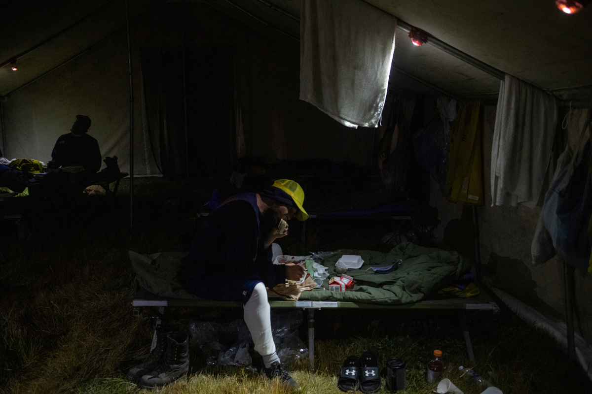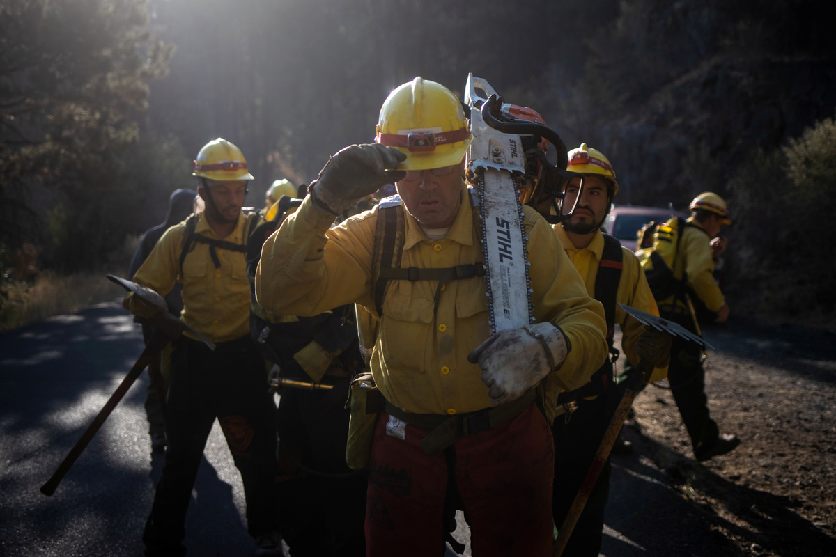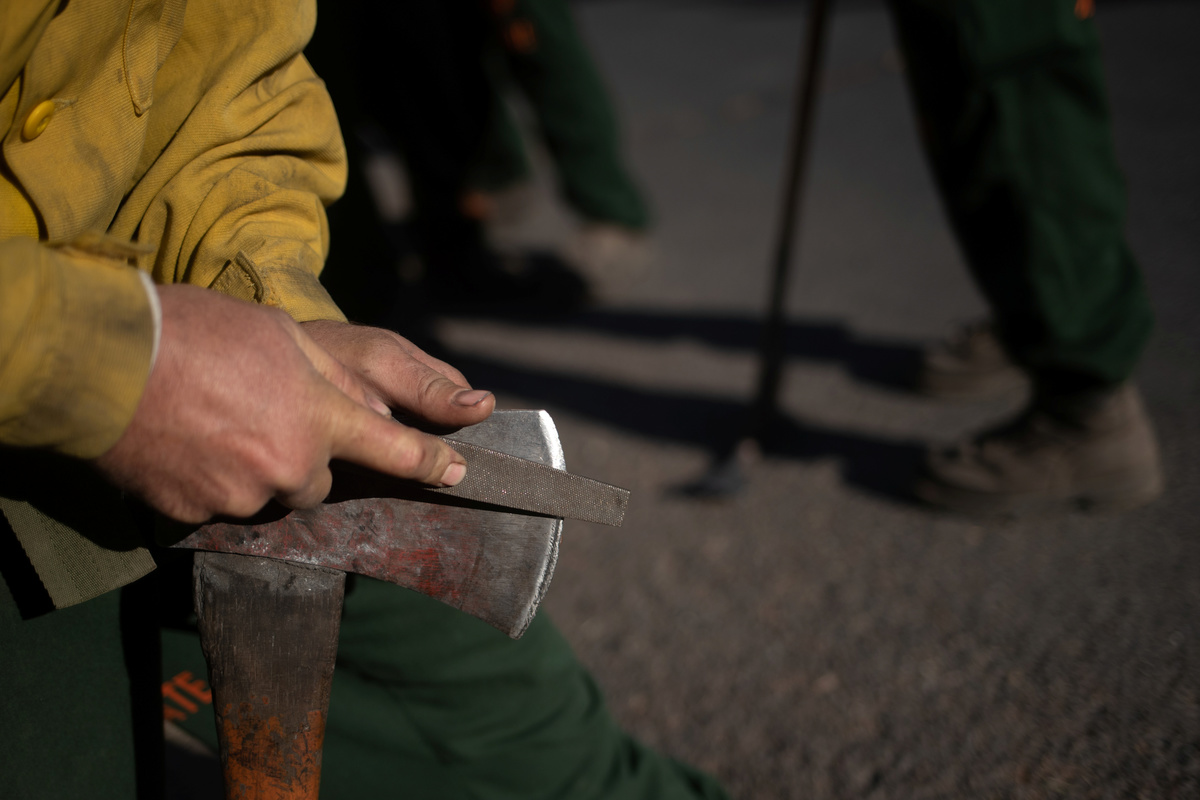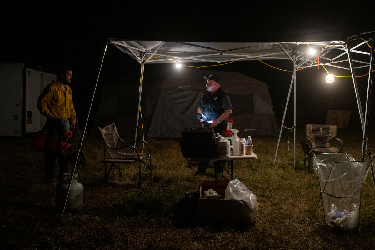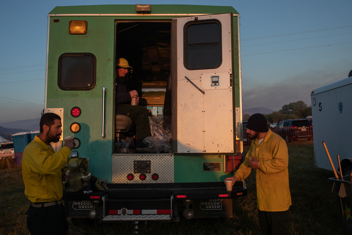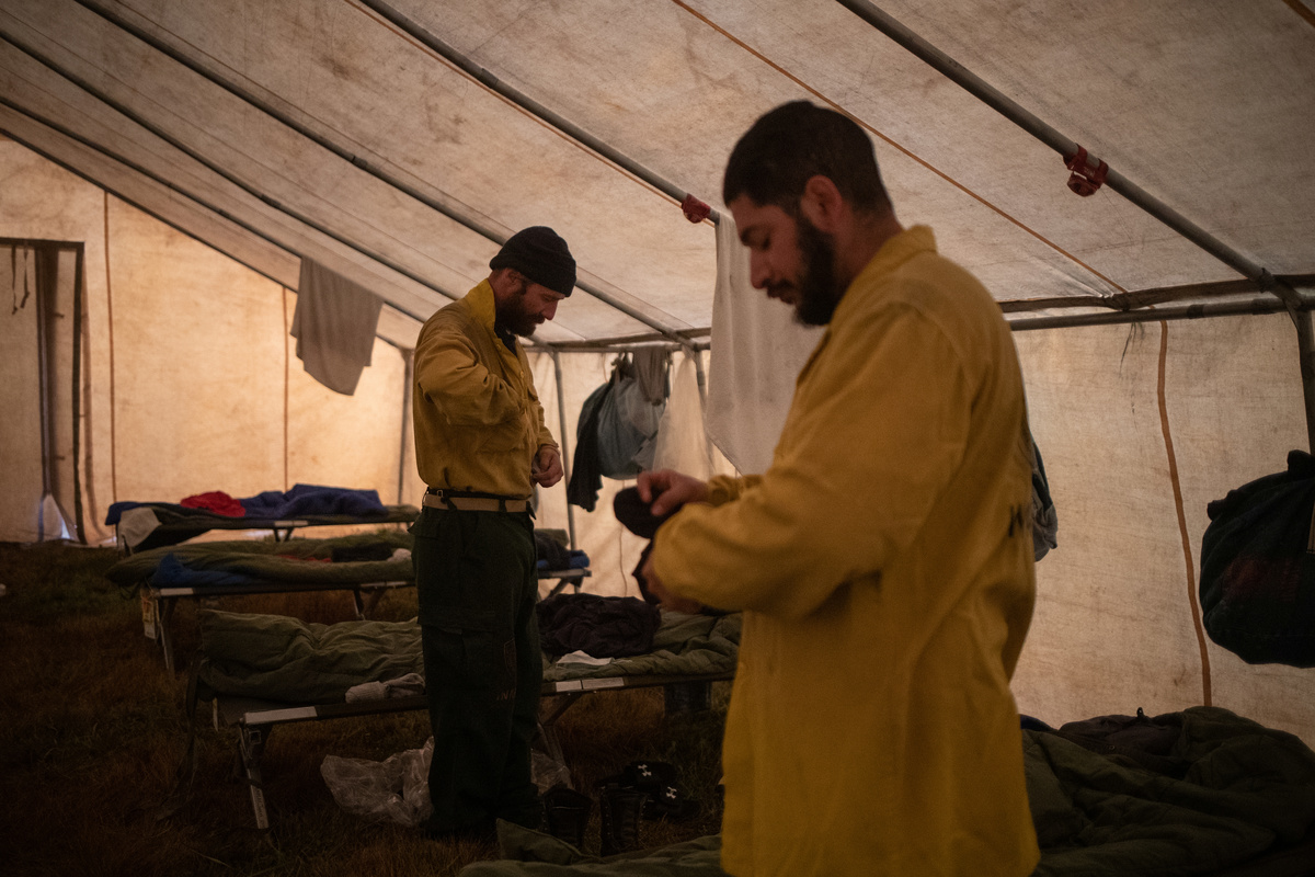 Edgar Maya, 30, Matthew Tice, 37, and Armando Gomez-Zacarias, 24, who are inmates from Warner Creek Correctional Facility, working as firefighters, wait for the rest of the firefighting crew after descending in the dark out of Fremont National Forest, where they were helping to mop up hotspots from the Brattain Fire, near Paisley, Oregon, U.S., September 19, 2020. REUTERS/Adrees Latif A dust devil kicks up ash and dirt in the aftermath of the Brattain Fire near Fremont National Forest near Paisley, Oregon, U.S., September 19, 2020. REUTERS/Adrees Latif Inmates from Warner Creek Correctional Facility, working as firefighters, are transported in a secure vehicle as they travel towards the Brattain Fire, Paisley, Oregon, U.S., September 19, 2020. REUTERS/Adrees Latif Inmates from Warner Creek Correctional Facility put on flame-resistant clothing as they wake up and get ready to help mop up hotspots from the Brattain Fire, in Paisley, Oregon, U.S., September 19, 2020. REUTERS/Adrees Latif A ponderosa pine tree is cut down after having burnt in the Brattain Fire, at Fremont National Forest, near Paisley, Oregon, U.S., September 19, 2020. REUTERS/Adrees LatifA sign reading "We Will Beat This Together, COVID-19" stands at a camp where inmates from Warner Creek Correctional Facility, working as firefighters, were being housed, while helping to mop up hotspots from the Brattain Fire in Paisley, Oregon, U.S., September 19, 2020. REUTERS/Adrees Latif Joshua Rutledge, 42, and Guillermo Rojas, 29, who are inmates from Warner Creek Correctional Facility, working as firefighters, prepare to help mop up hotspots from the Brattain Fire, after waking up in Paisley, Oregon, U.S., September 19, 2020. REUTERS/Adrees LatifSmoke rises up from the Brattain Fire, as trees burn in Fremont National Forest, in Paisley, Oregon, U.S., September 18, 2020. REUTERS/Adrees Latif Inmates from Warner Creek Correctional Facility, working as firefighters, help to distribute lunch to firefighters and first responders tasked with helping to mop up hotspots from the Brattain Fire in Paisley, Oregon, U.S., September 21, 2020. REUTERS/Adrees LatifThe belongings of an inmate from Warner Creek Correctional Facility, working as a firefighter, is left next to his bed where he and other inmates are camping out on the sidelines of the Brattain Fire, helping to mop up hotspots, in Paisley, Oregon, U.S., September 21, 2020. REUTERS/Adrees LatifGuillermo Rojas, 29, an inmate from Warner Creek Correctional Facility, working as a firefighter, has his temperature checked before heading into the field to help mop up hotspots from the Brattain Fire in Paisley, Oregon, U.S., September 21, 2020. REUTERS/Adrees Latif Joshua Rutledge, 42, and other inmates from Warner Creek Correctional Facility, working as firefighters, eat dinner under the light of a headlamp after returning to camp after helping to mop up hotspots from the Brattain Fire in Paisley, Oregon, U.S., September 20, 2020. REUTERS/Adrees Latif Joshua Rutledge, 42, and other inmates from Warner Creek Correctional Facility, working as firefighters, wait to take showers after returning to camp after helping to mop up hotspots from the Brattain Fire in Paisley, Oregon, U.S., September 20, 2020. REUTERS/Adrees LatifArmando Gomez-Zacarias, 24, an inmate from Warner Creek Correctional Facility, working as a firefighter, shaves his beard after returning to camp after helping to mop up hotspots from the Brattain Fire in Paisley, Oregon, U.S., September 20, 2020. REUTERS/Adrees LatifCorrectional Officers from Warner Creek Correctional Facility David Halbleib and Weldon Reedy, speak to each other as inmates, working as firefighters, return to camp after helping to mop up hotspots from the Brattain Fire in Paisley, Oregon, U.S., September 20, 2020. REUTERS/Adrees LatifDouglas White, 28, an inmate from Warner Creek Correctional Facility, working as a firefighter, wipes dust and sweat off his face after descending out of Fremont National Forest, where he and a crew of other inmates helped to mop up hotspots from the Brattain Fire near Paisley, Oregon, U.S., September 20, 2020. REUTERS/Adrees LatifInmates from Warner Creek Correctional Facility, working as firefighters, walk side-by-side in a grid formation as they help to mop up remaining hot spots from the Brattain Fire in Fremont National Forest near Paisley, Oregon, U.S., September 20, 2020. REUTERS/Adrees LatifInmates from Warner Creek Correctional Facility, working as firefighters, kick up ash as they descend out of Fremont National Forest, while helping to mop up remaining hot spots from the Brattain Fire in Fremont National Forest near Paisley, Oregon, U.S., September 20, 2020. REUTERS/Adrees LatifInmates from Warner Creek Correctional Facility, working as firefighters, mop up a hot spot from the Brattain Fire in Fremont National Forest near Paisley, Oregon, U.S., September 20, 2020. REUTERS/Adrees Latif Matthew Tice, 37, an inmate from Warner Creek Correctional Facility, working as a firefighter, takes a break as he rests in Fremont National Forest as he and other inmates who are also working as firefighters, help to mop up hotspots from the Brattain Fire near Paisley, Oregon, U.S., September 20, 2020. REUTERS/Adrees LatifAn inmate from Warner Creek Correctional Facility, working as a firefighter, sharpens an ax before helping to mop up hotspots from the Brattain Fire near Paisley, Oregon, U.S., September 20, 2020. REUTERS/Adrees Latif