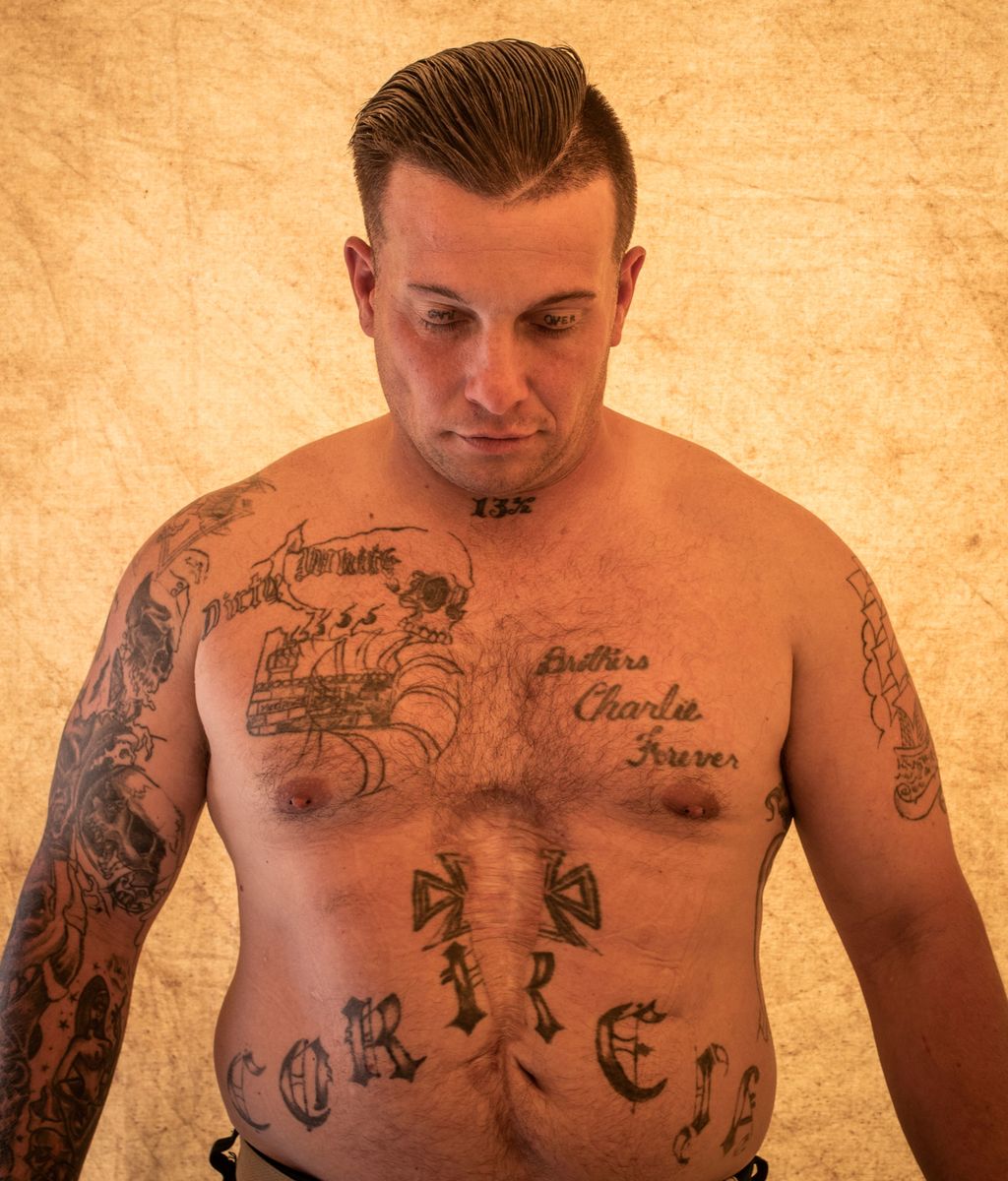 Eddie Correia, 36, an inmate from Warner Creek Correctional Facility, working as a firefighter, shows his tattoos as he poses for a photograph, on the sidelines of the Brattain Fire in Paisley, Oregon, U.S., September 21, 2020. Correia says he survived a birdshot from a shotgun. REUTERS/Adrees Latif