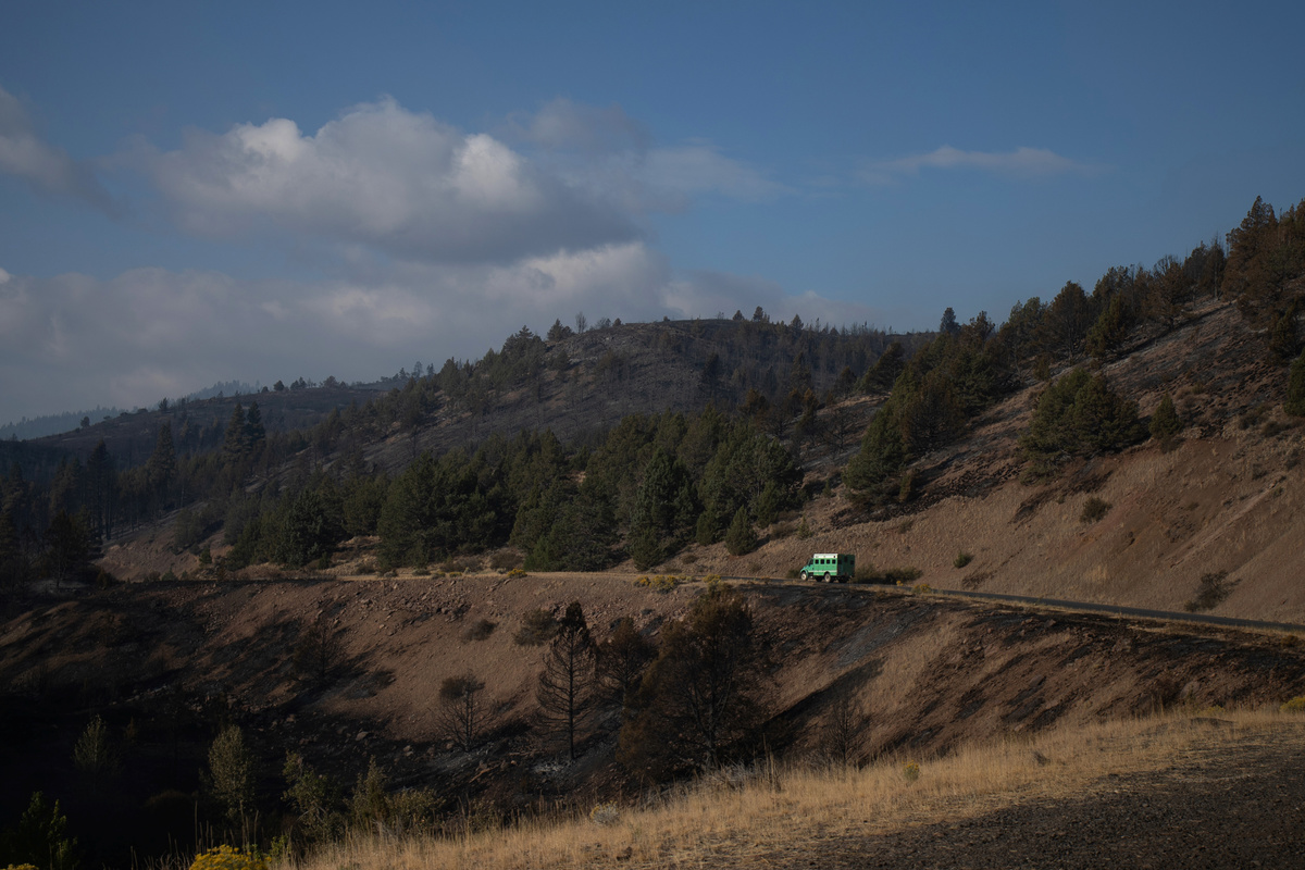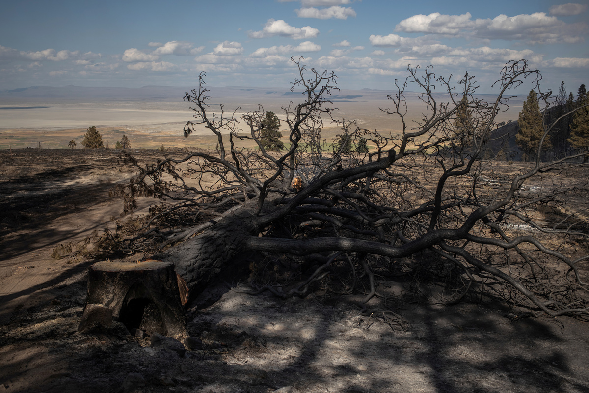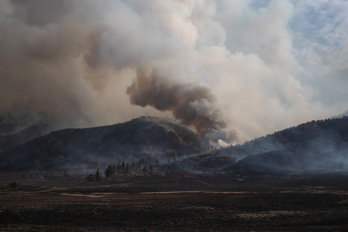 Around them, the flat green pastures of the Fremont National Forest run right up to the fire-devastated mountains, where billows of white smoke float upward from the flames.