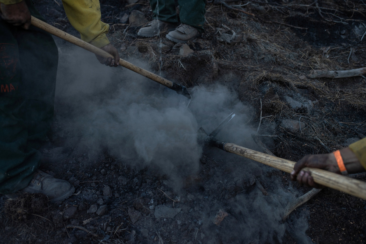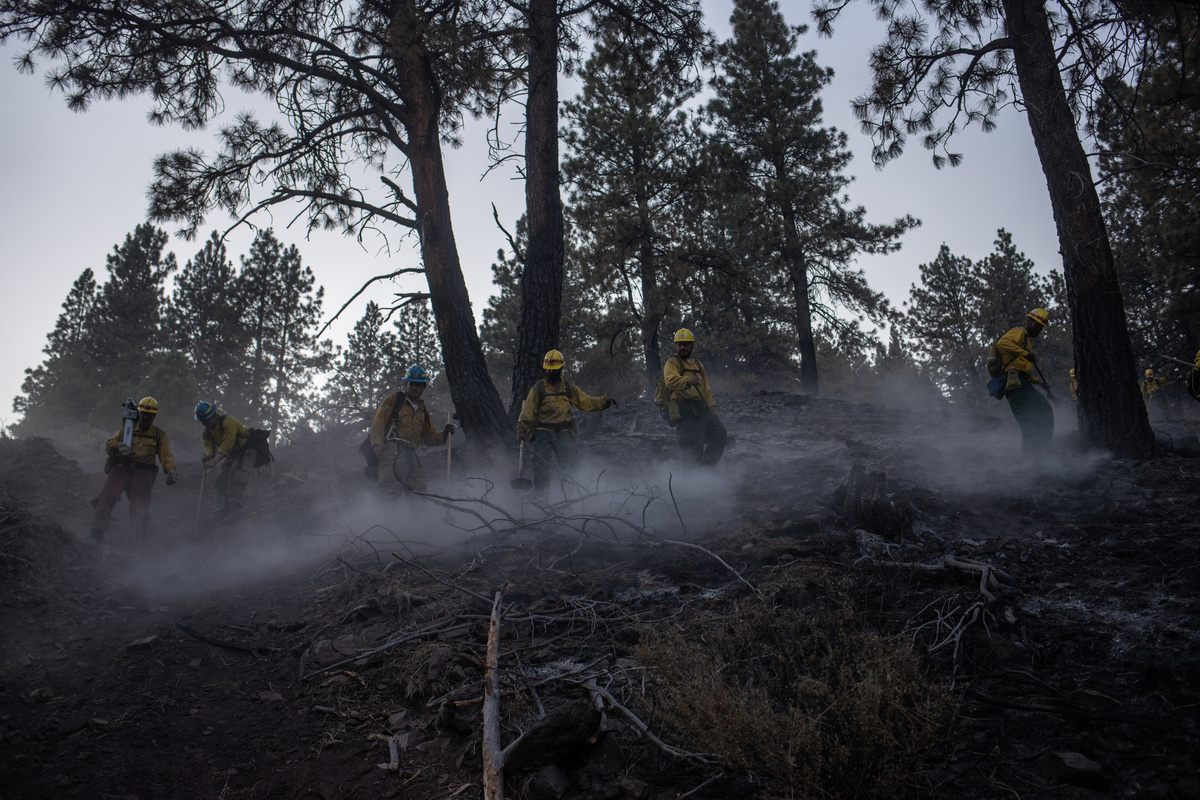The men in a crew working the forested mountains near Paisley, Oregon, last week were mostly young and fit. They had to be to scale the punishing terrain. Ankle-deep ash slicked hills and meant the men slipped two steps back for each stride forward.