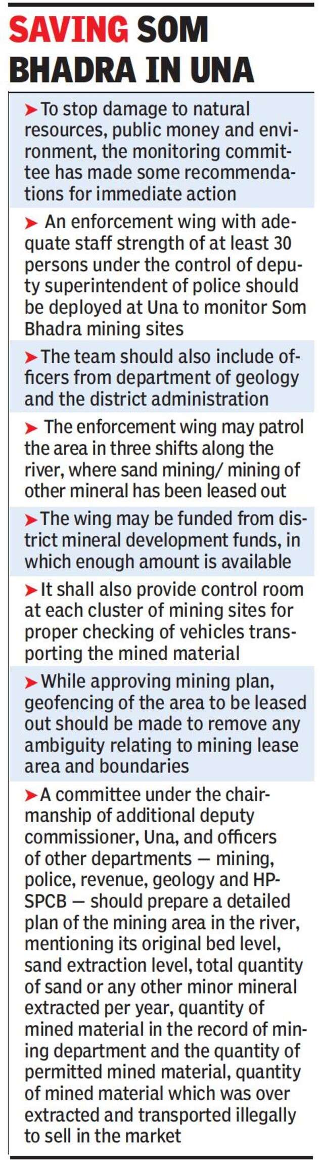 Report said that since a lot of indiscriminate and over extraction of sand involving unscientific method and deep dug places have been found in Som Bhadra in almost all mining sites either on government land or by private land owner, it is not advisable to allow mining leases in the area for atleast one year till the replenishment of all the dugged mines is properly occurred and bed level of the river comes to its original level.