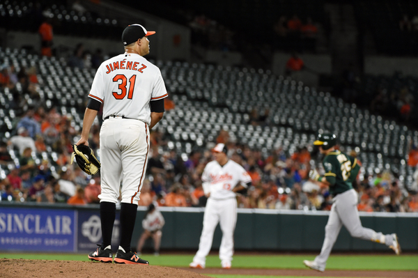 Jimenez allowed home runs to Jed Lowrie and Ryon Healy in the first inning, then settled down to hold the A's scoreless until the fifth, when Healy struck again to give his team a five-run lead. The homers were Healy's 22nd and 23rd of the season.