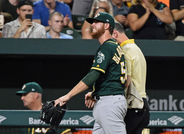 Oakland right-hander Paul Blackburn was pitching a terrific game through four innings, but a line drive off the bat of Trey Mancini hit him squarely on the right wrist and apparently did some real damage. Blackburn was in tremendous pain and he left the field with the athletic trainer keeping his arm immobilized.
