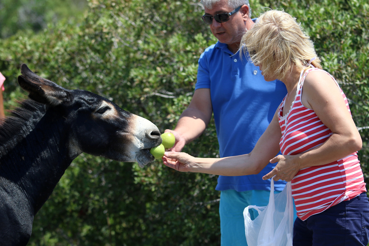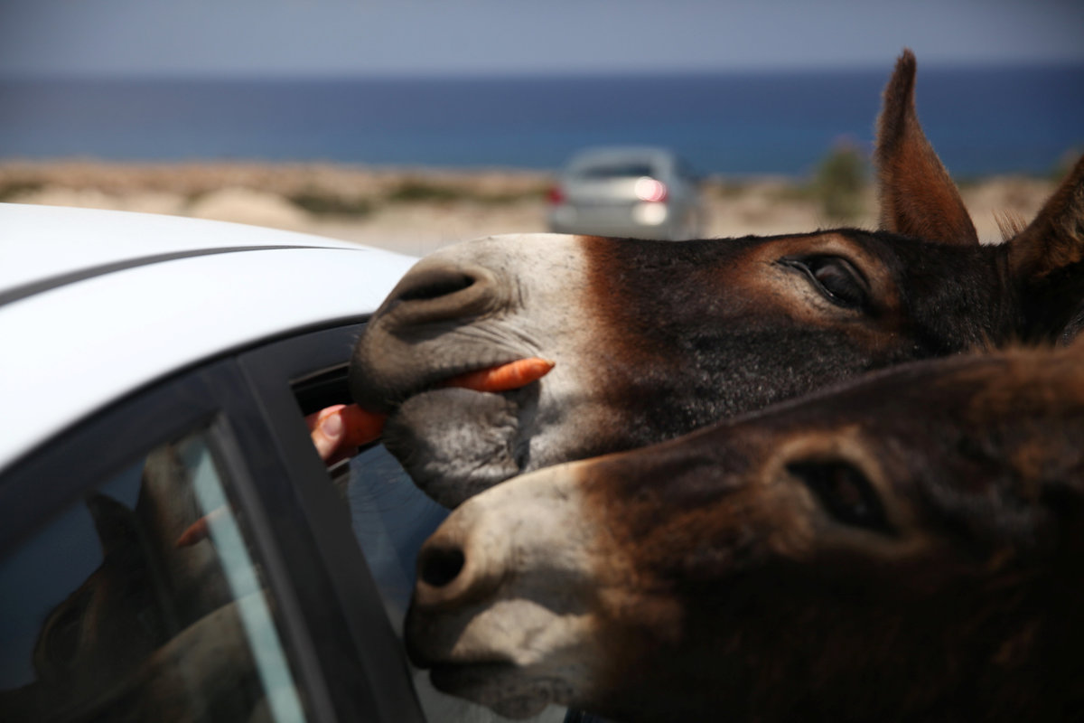Drivers frequently find packs on the meandering narrow roads, refusing to budge until the windows are wound down. Ears back and snouts pulled into a grin, the donkeys stick in their muzzles in the hope of a reward.