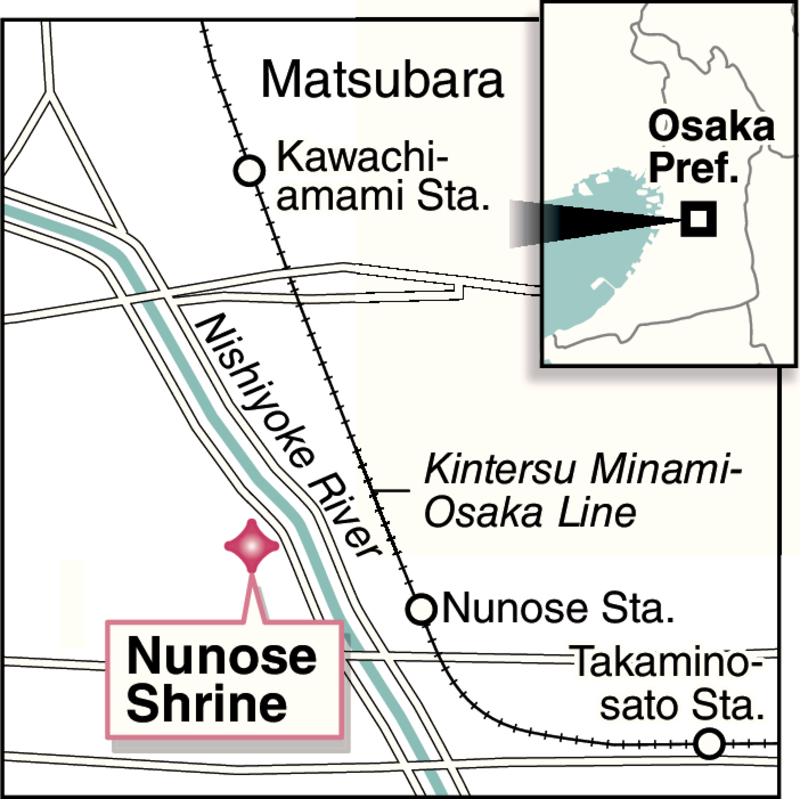 Surrounded by woods, Nunose Shrine is located along the Nishiyoke River that runs through the prefecture. The shrine's omikuji offering office was temporarily closed to prevent the spread of the novel coronavirus, but it reopened after the Osaka prefectural government's state of emergency was lifted.