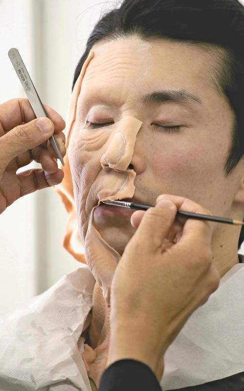 So delicate was Tsuji's touch, no line could be seen between the wrinkled "old" side of the model's face and his real-life younger side.