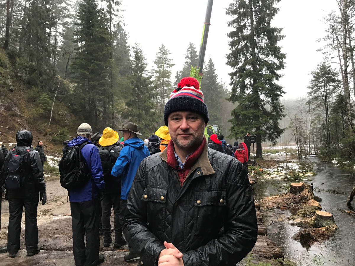 On Tuesday, with British and Norwegian officials attending and children singing Christmas carols, a 24-metre (79-foot) spruce was felled in drizzling rain and chilly temperatures.